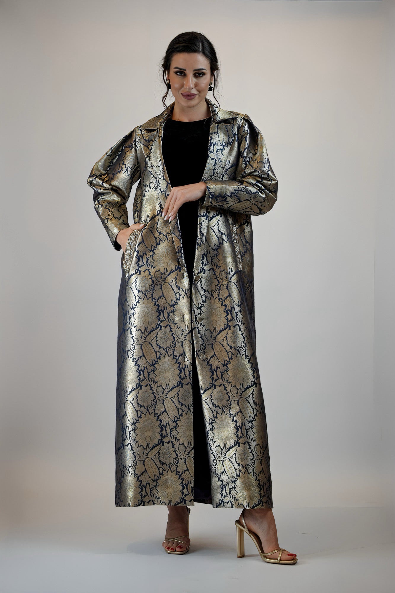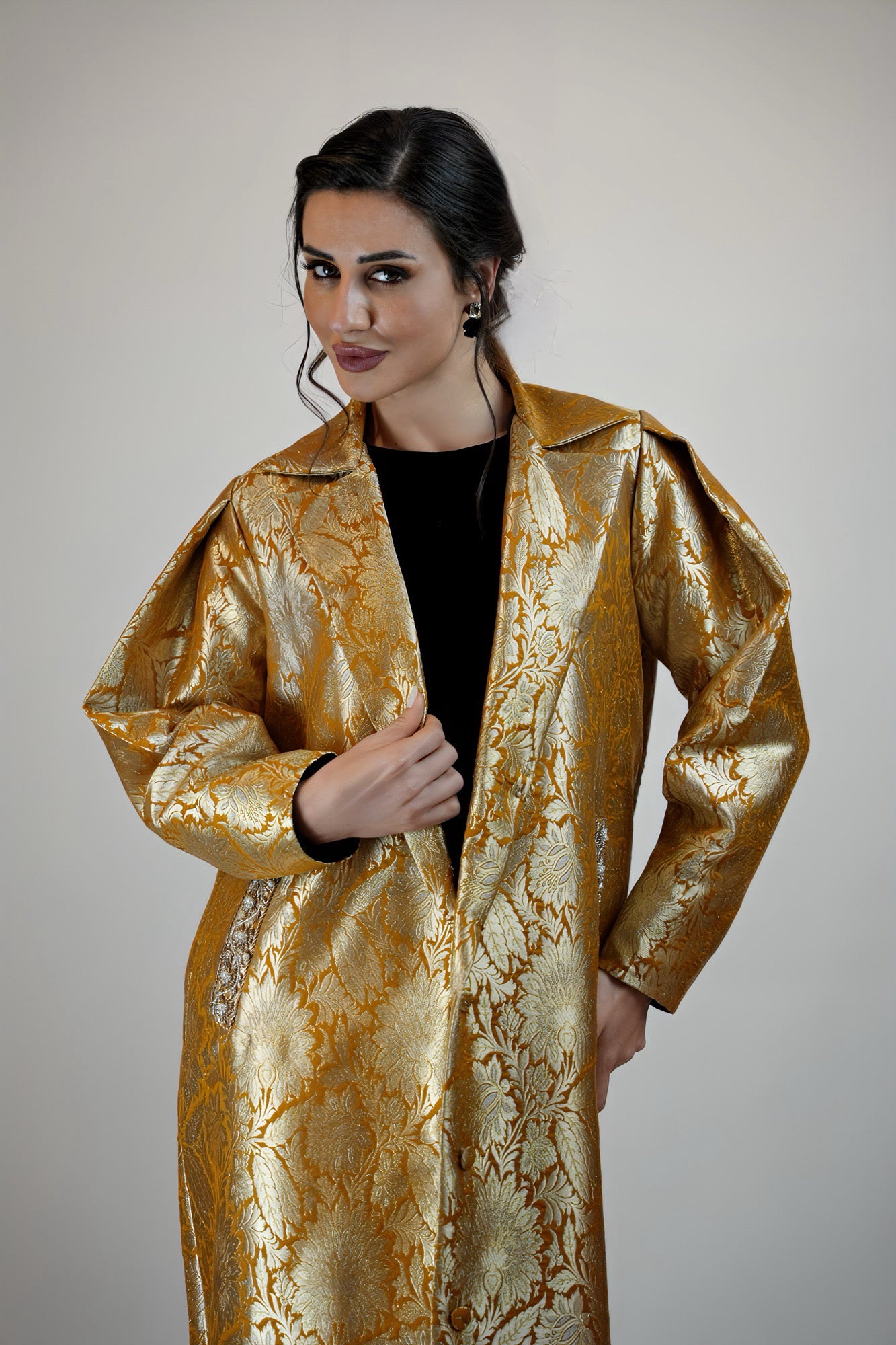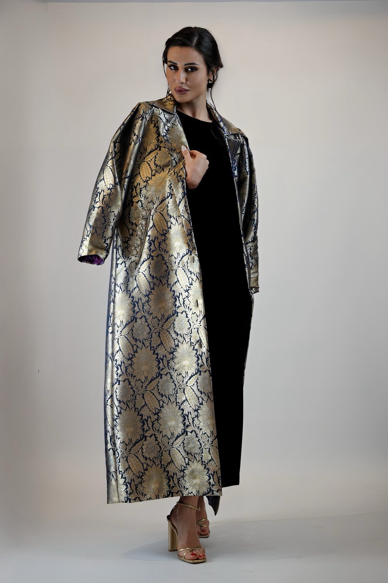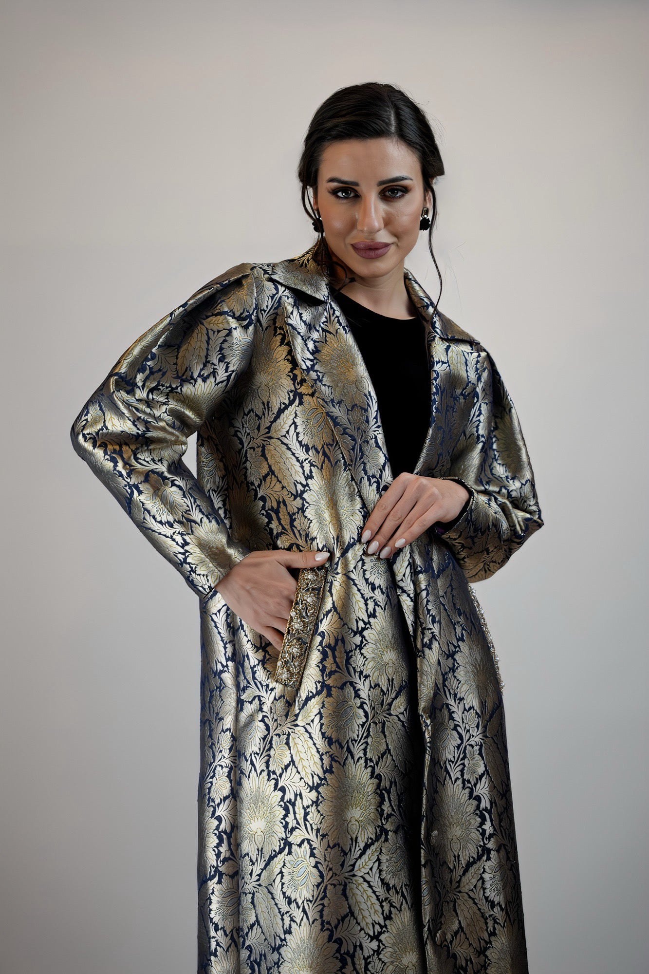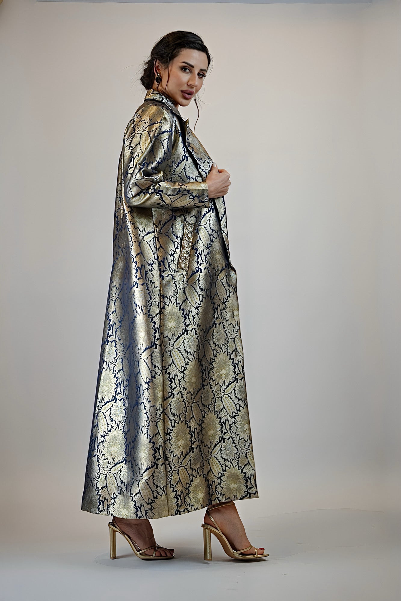 High fashion long blazer jackets in a traditional Atlas fabric giving it sheer fusion vibe. Contrasting inner adds interest to the design with intricate dapka handwork finishing the whole look beautifully.