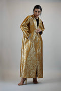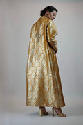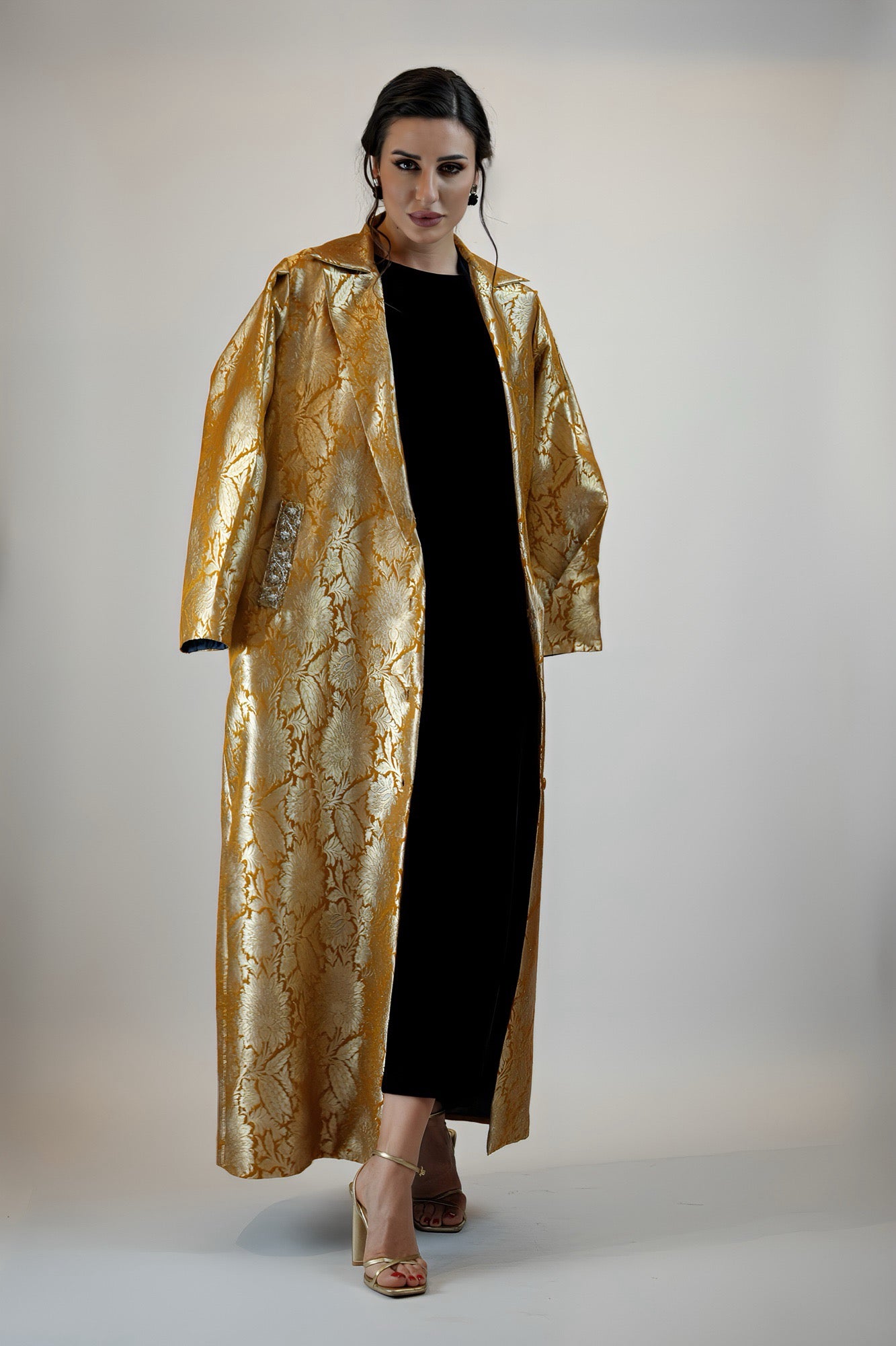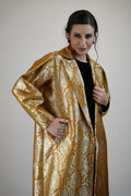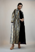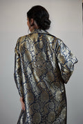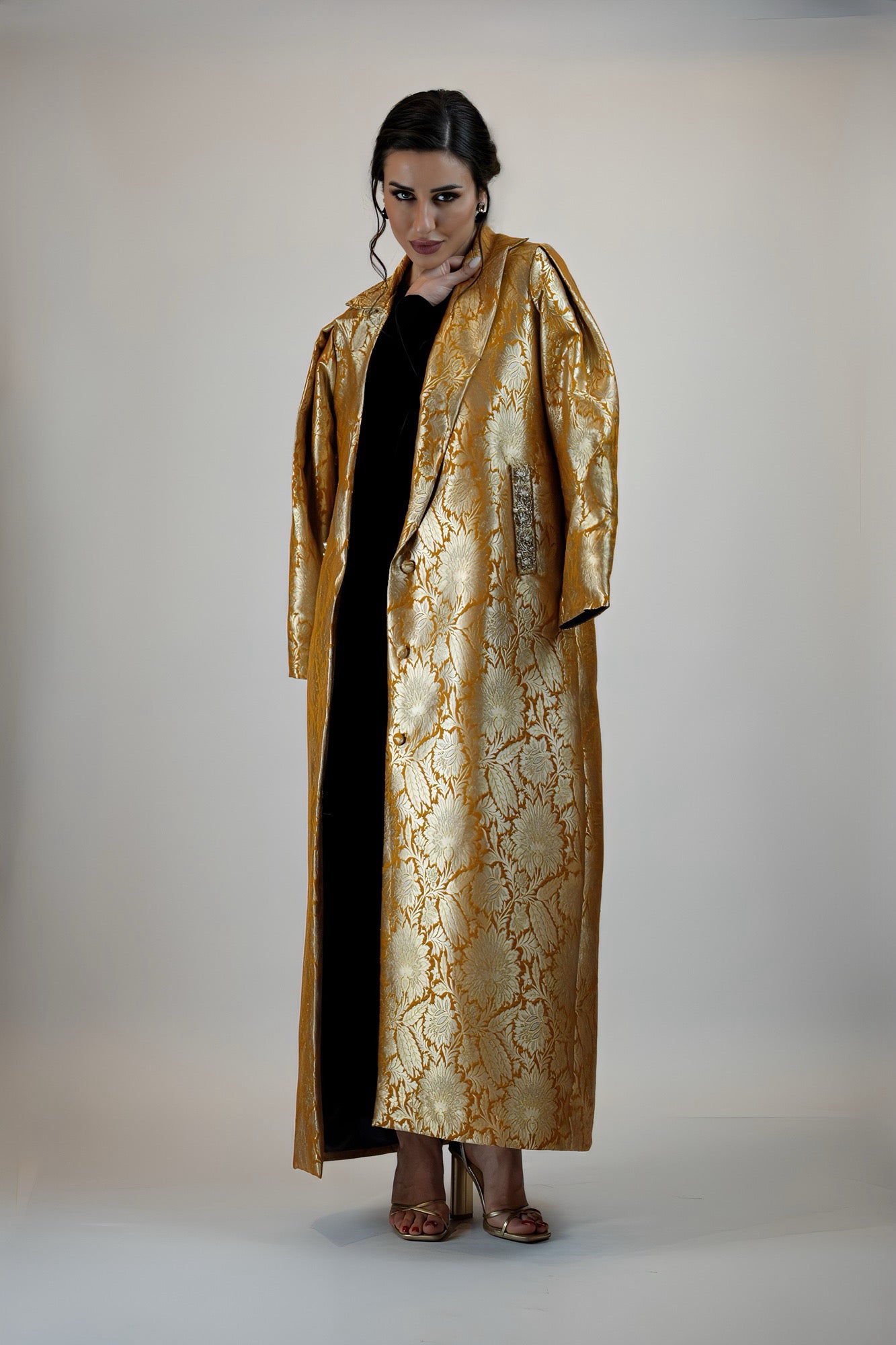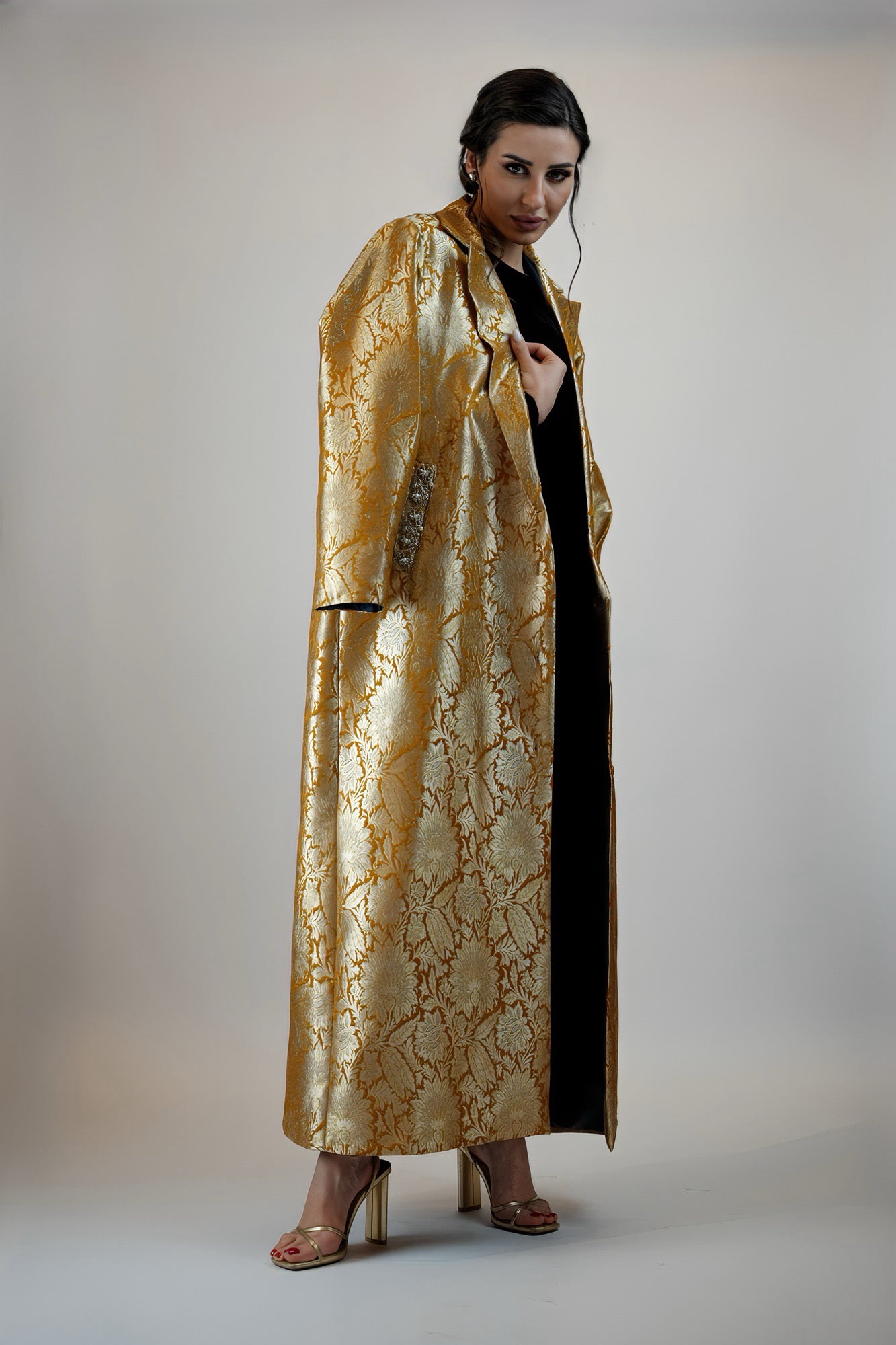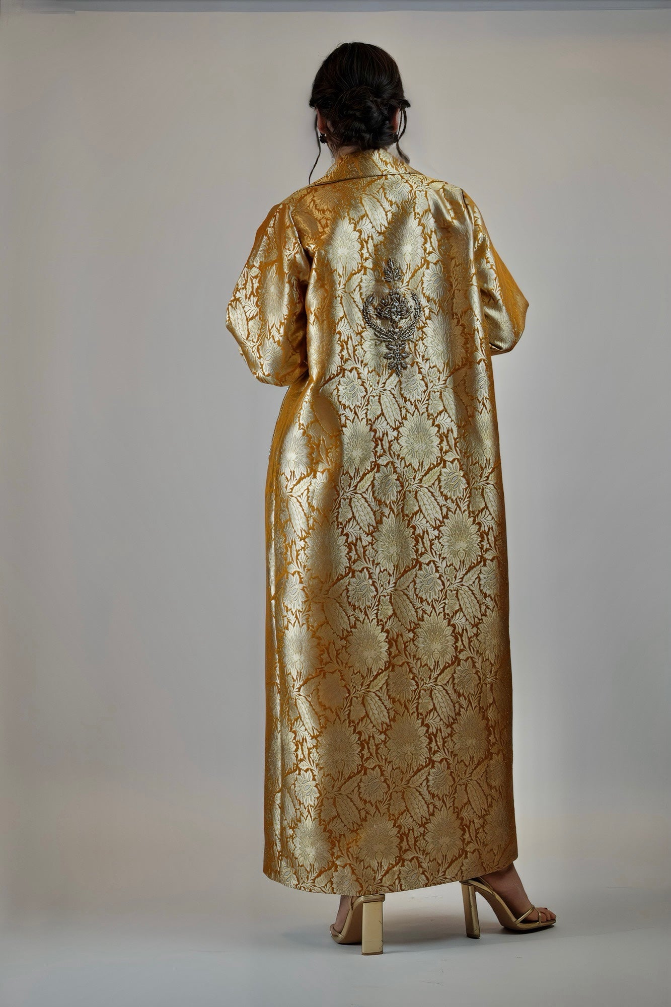 High fashion long blazer jackets in a traditional Atlas fabric giving it sheer fusion vibe. Contrasting inner adds interest to the design with intricate dapka handwork finishing the whole look beautifully.