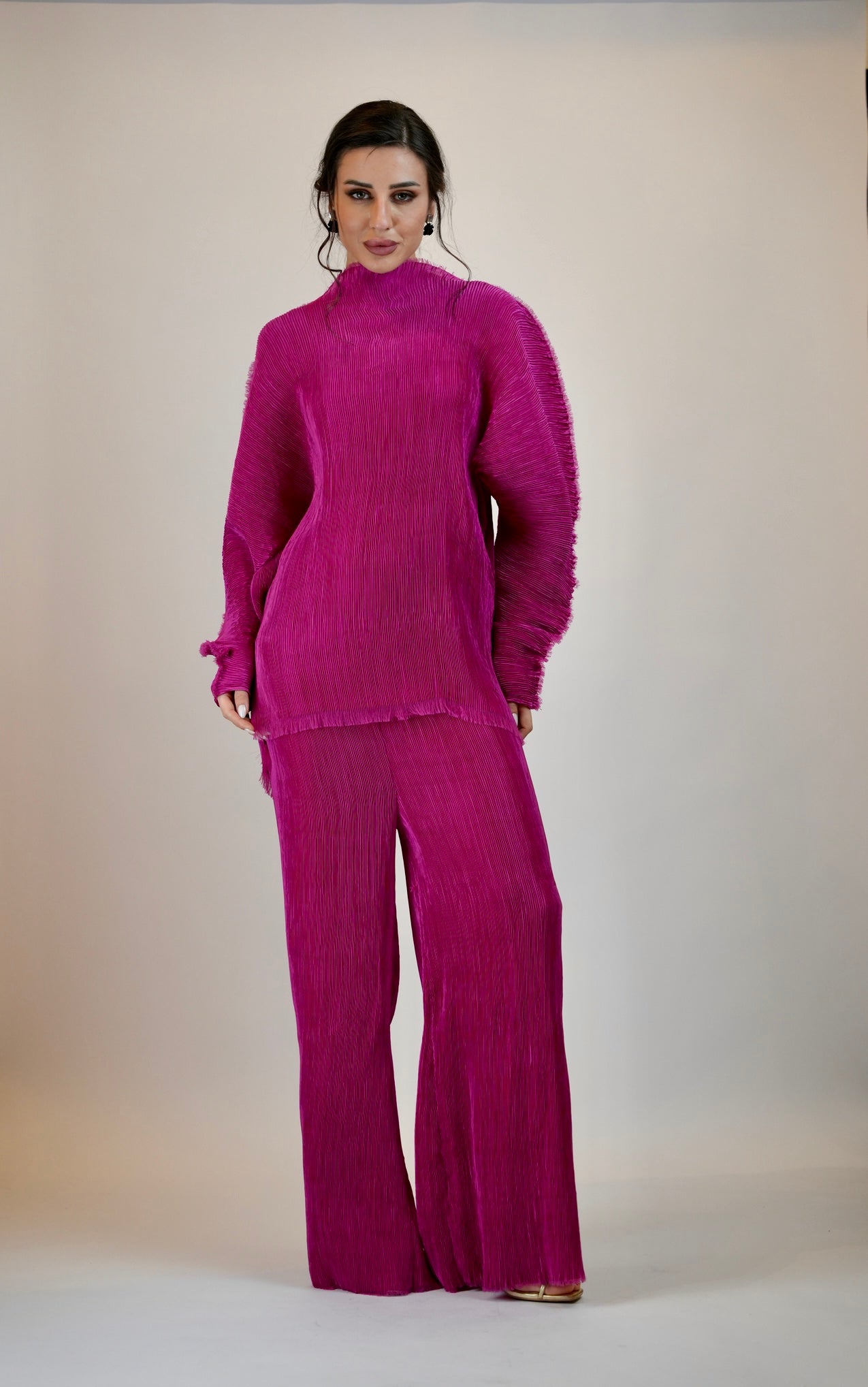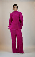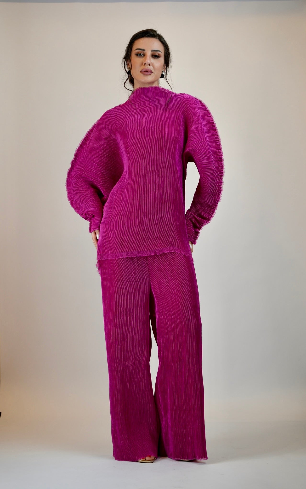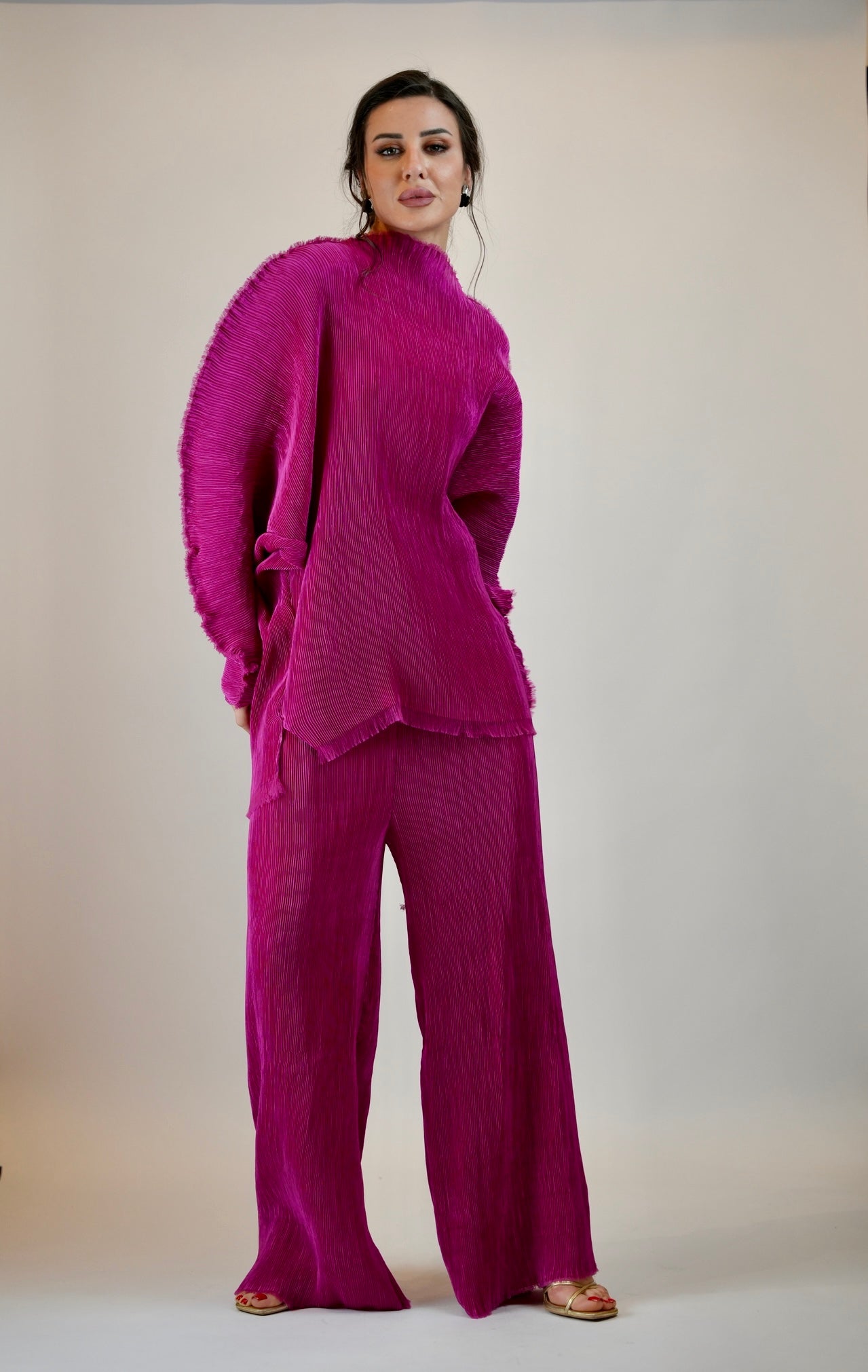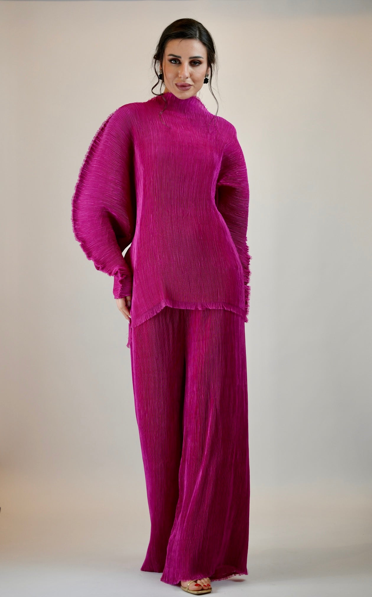 Crushed Silk co ord set in vibrant colors with poofy sleeves to give u that high fashion look instantly. Look chic within seconds. A pull out and throw it on kind of fabric with zero ironing n no maintenance needed.