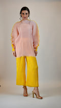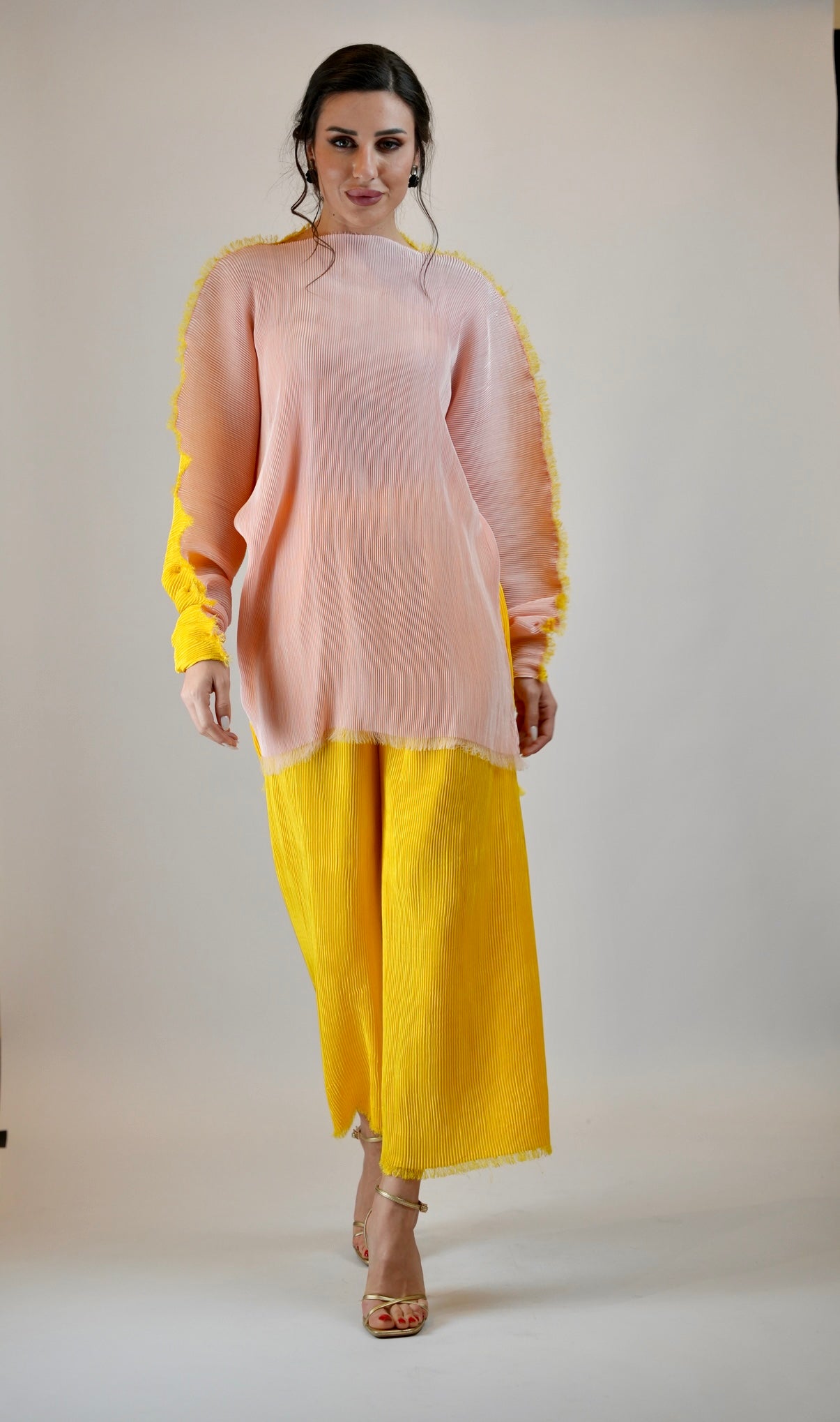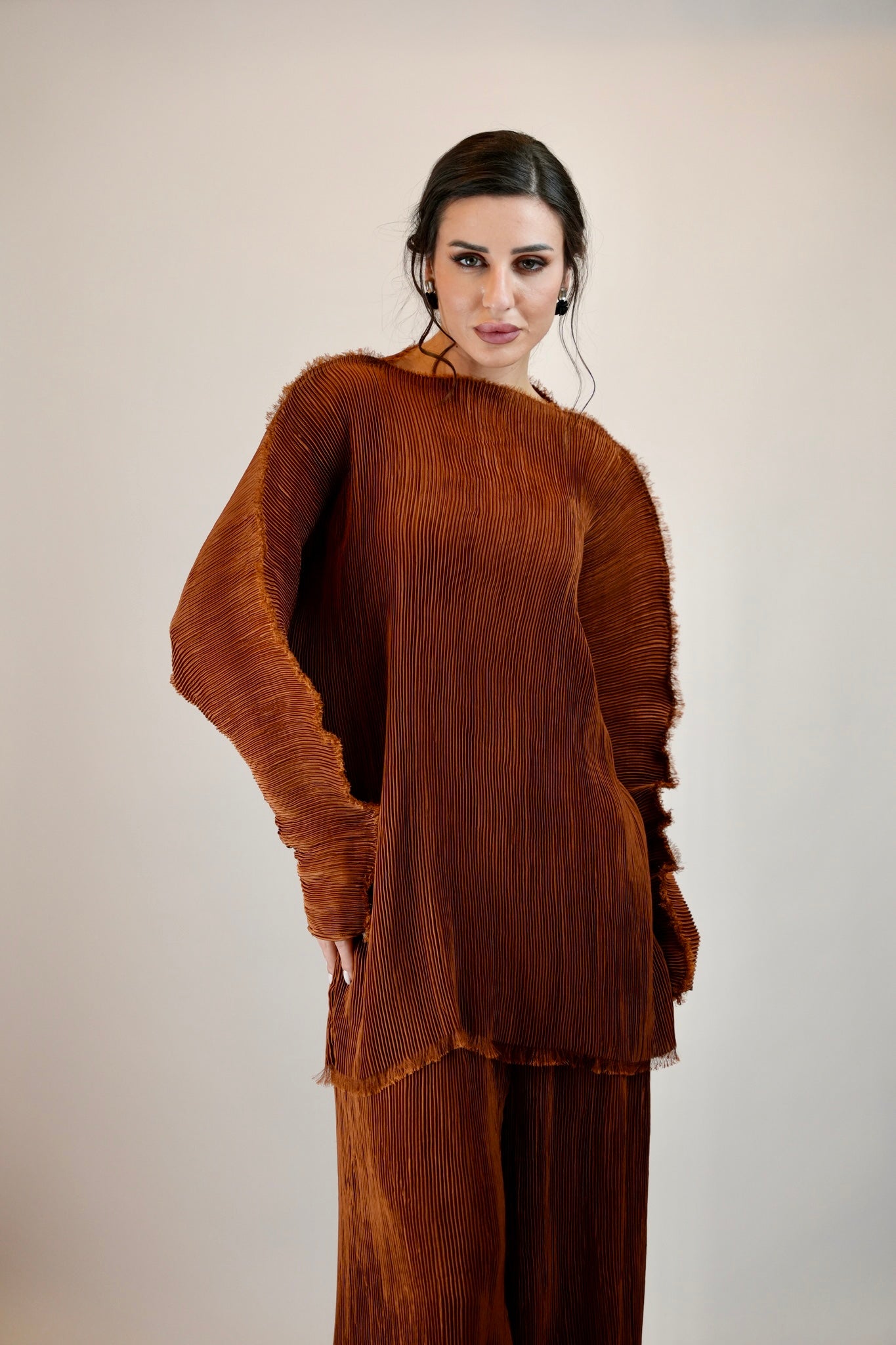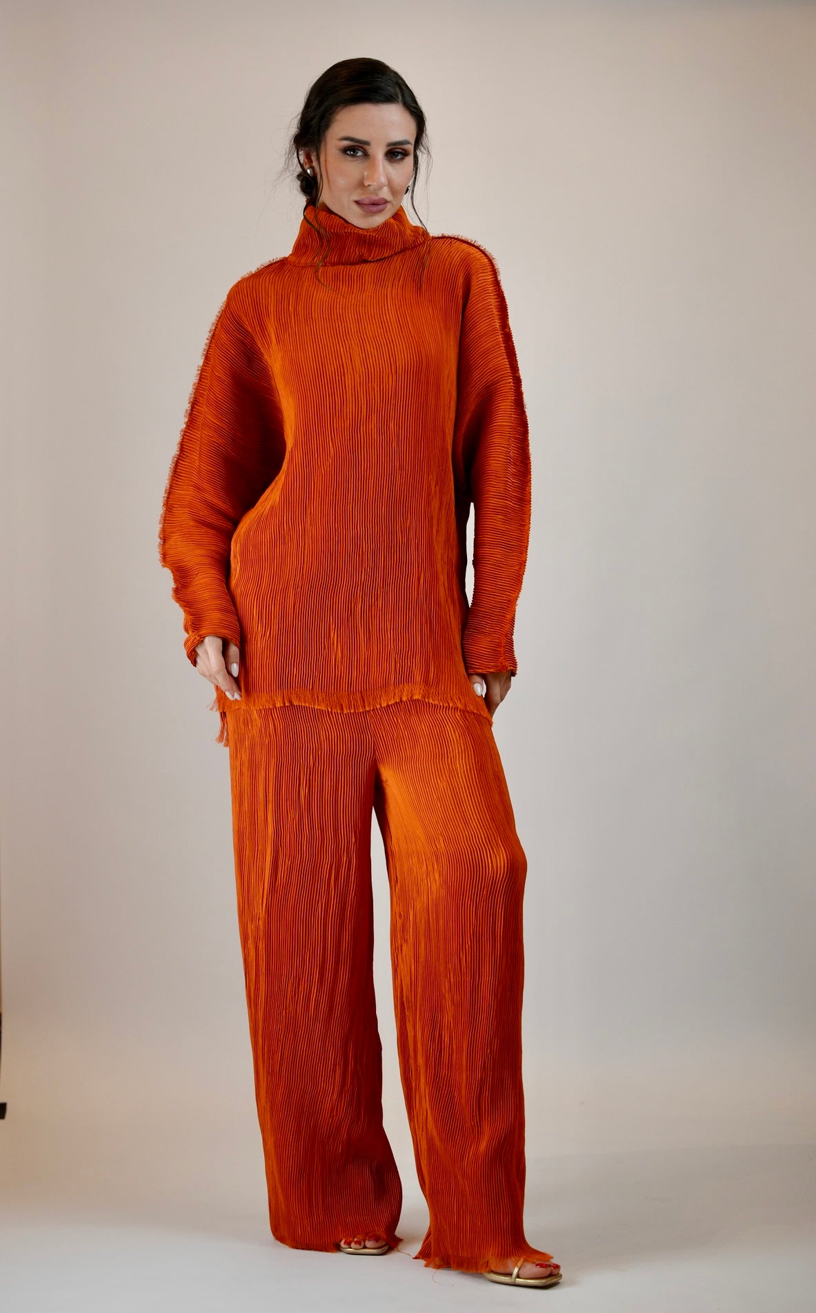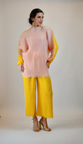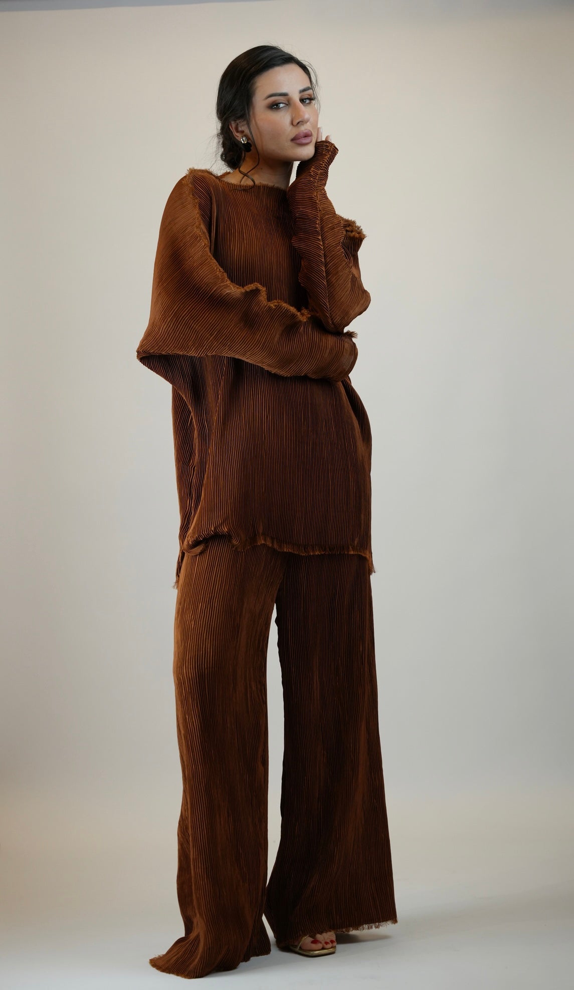 Crushed Silk co ord set in vibrant colors with poofy sleeves to give u that high fashion look instantly. Look chic within seconds. A pull out and throw it on kind of fabric with zero ironing n no maintenance needed.