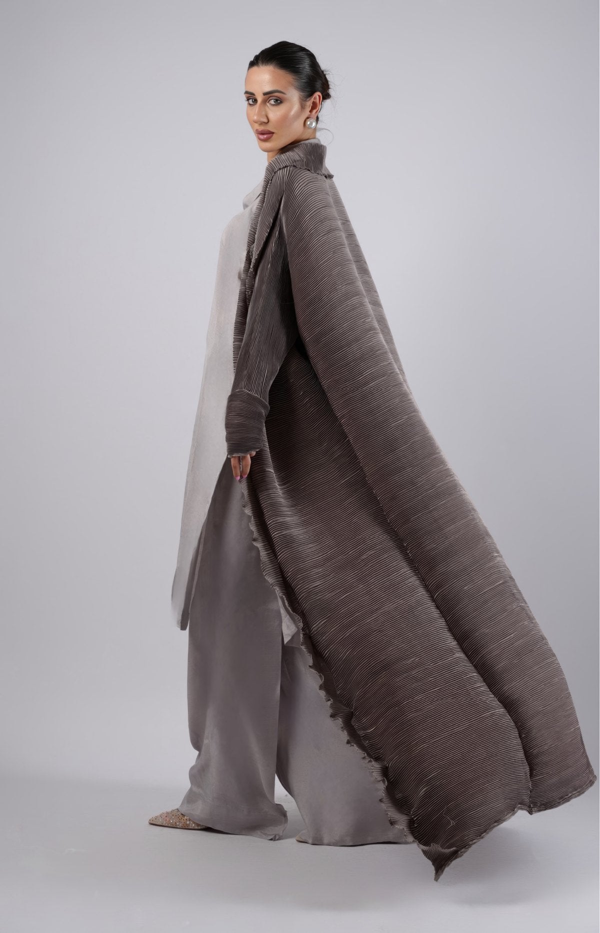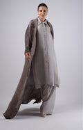 A long Crushed Silk Kaftan with a Silk lower set comprising of a Collared shirt and a straight trouser.