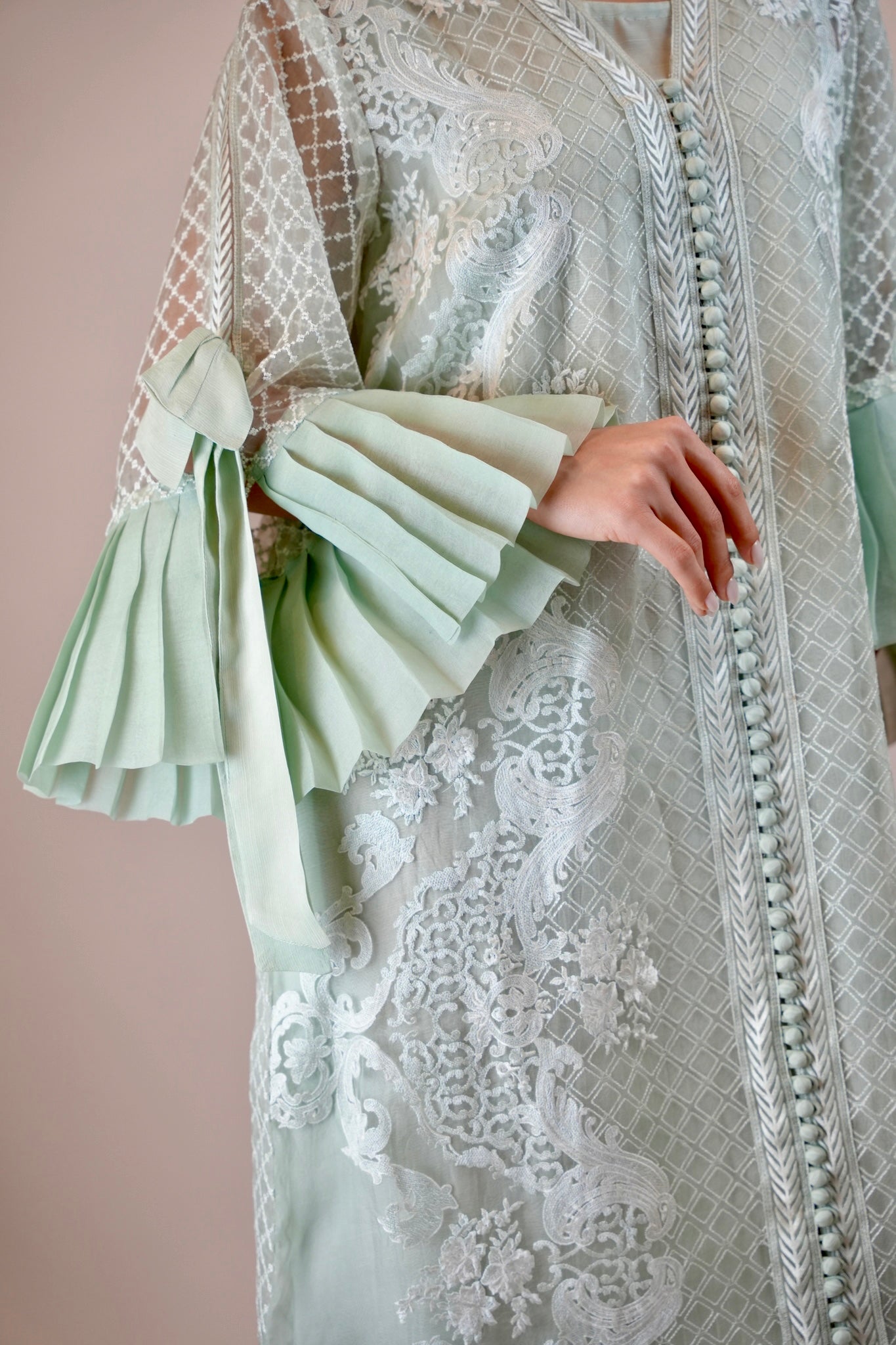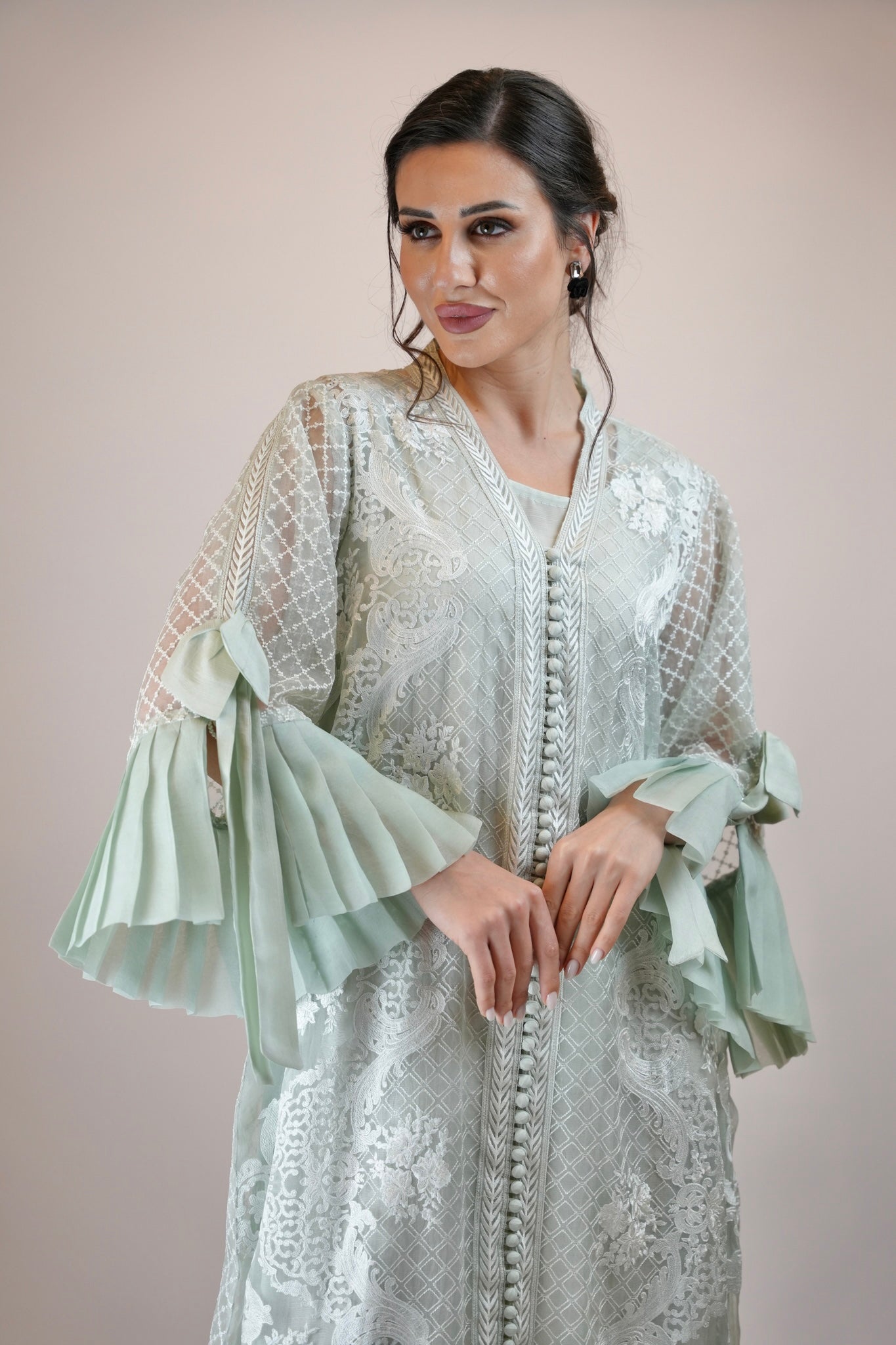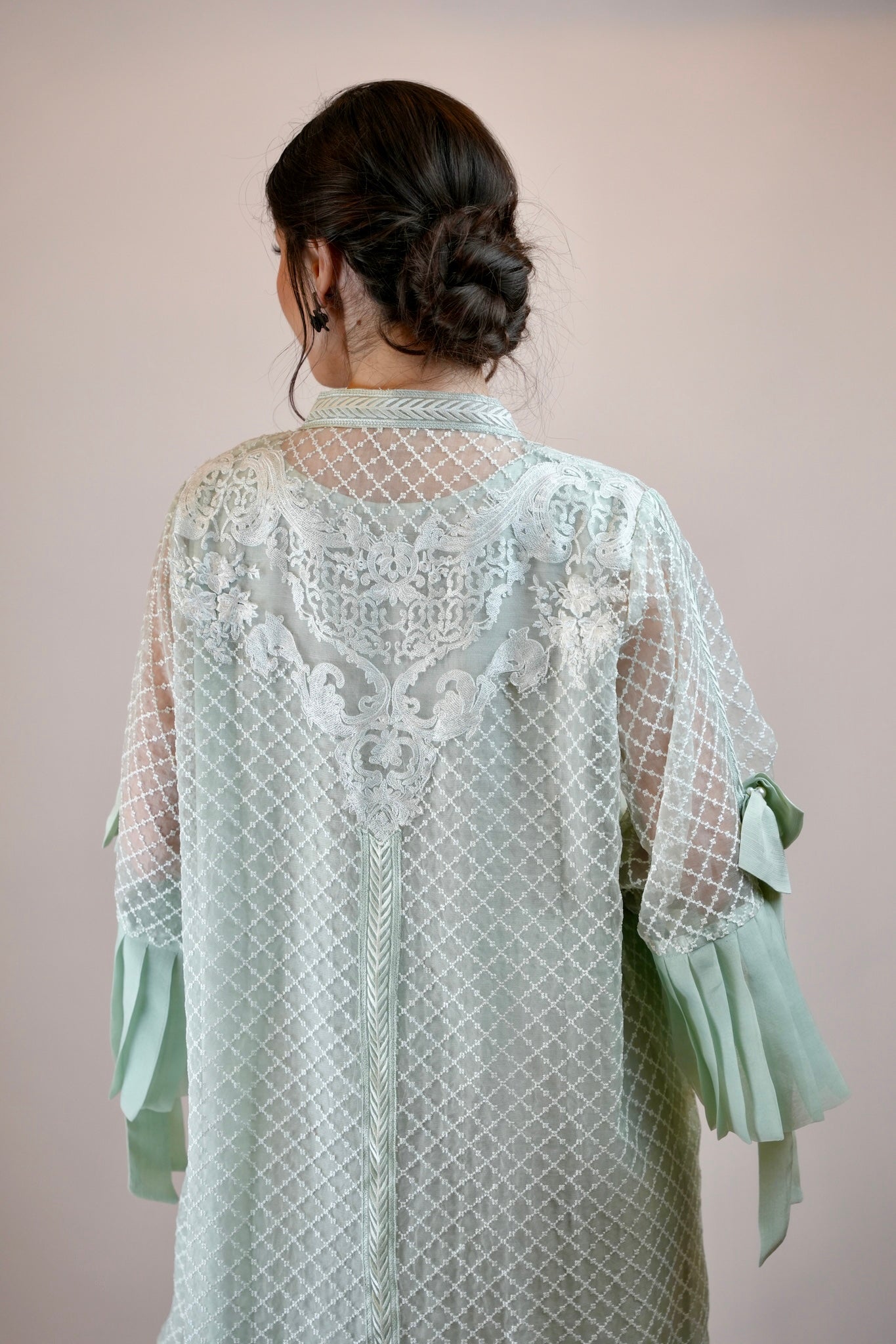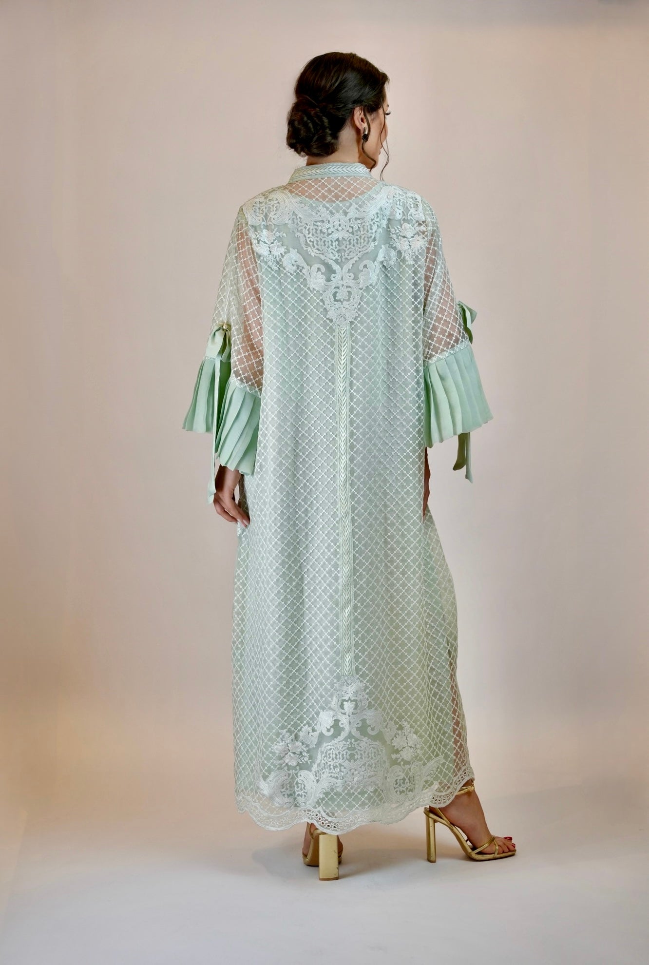 A gorgeous French style lace Kaftan with lots of frill, fun and frolic happening with the super feminine element of bows. We love it n so will u!