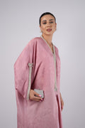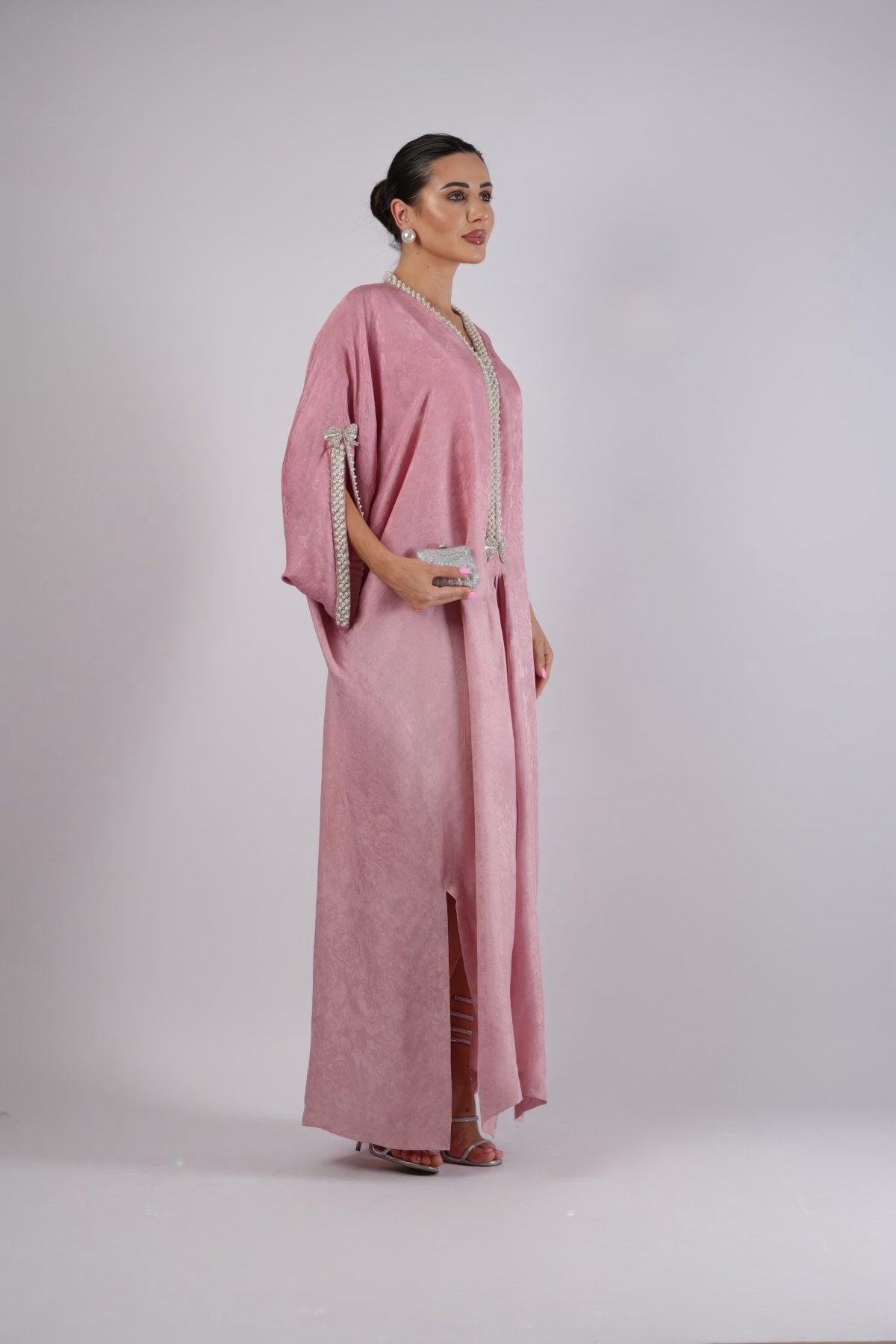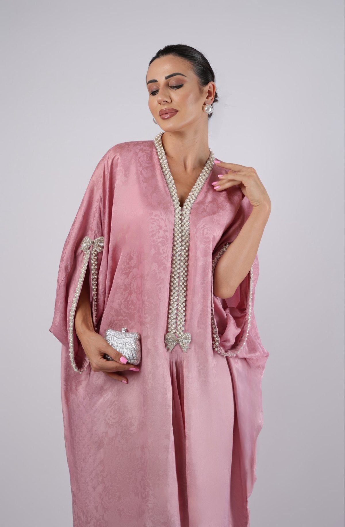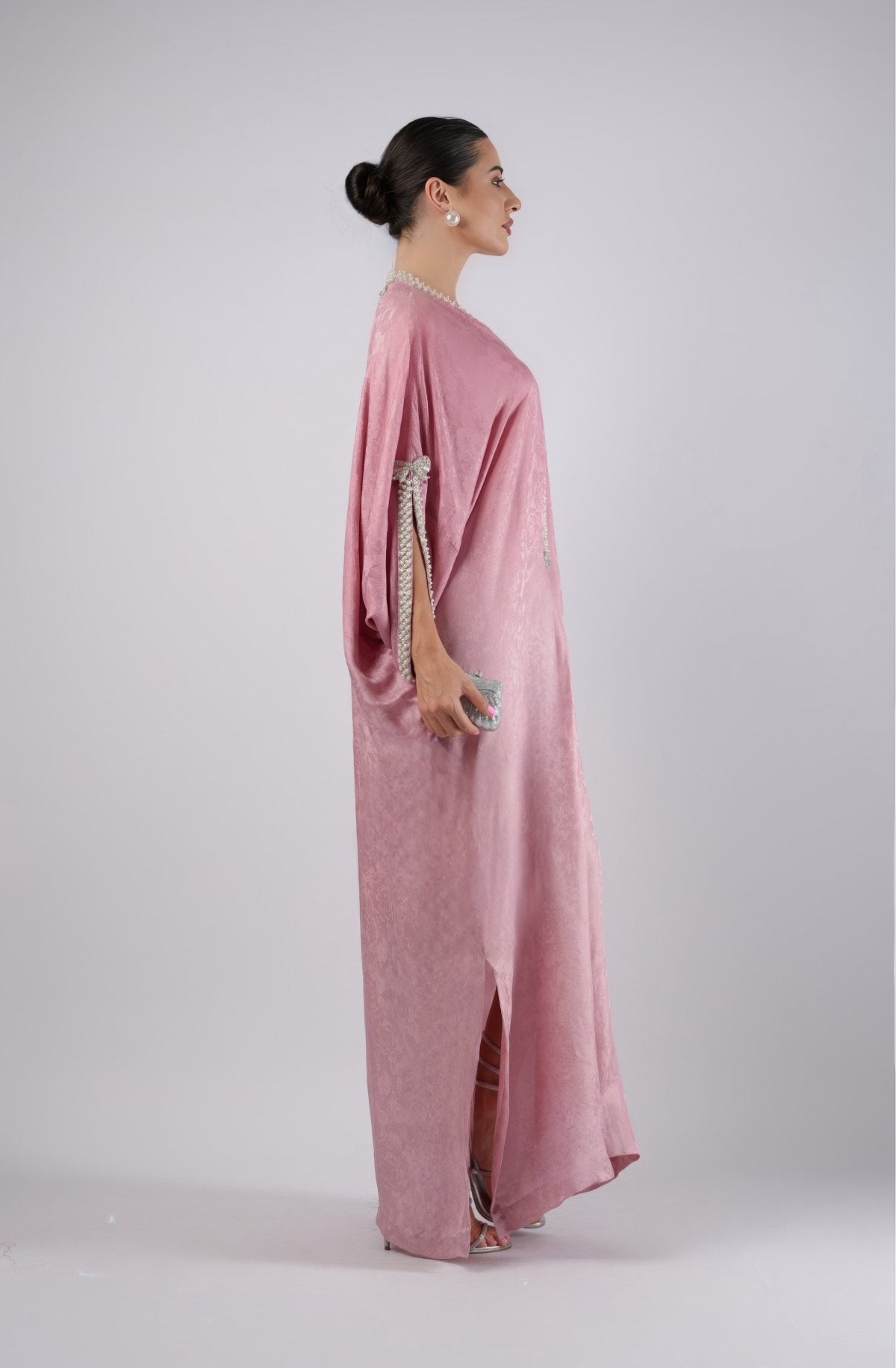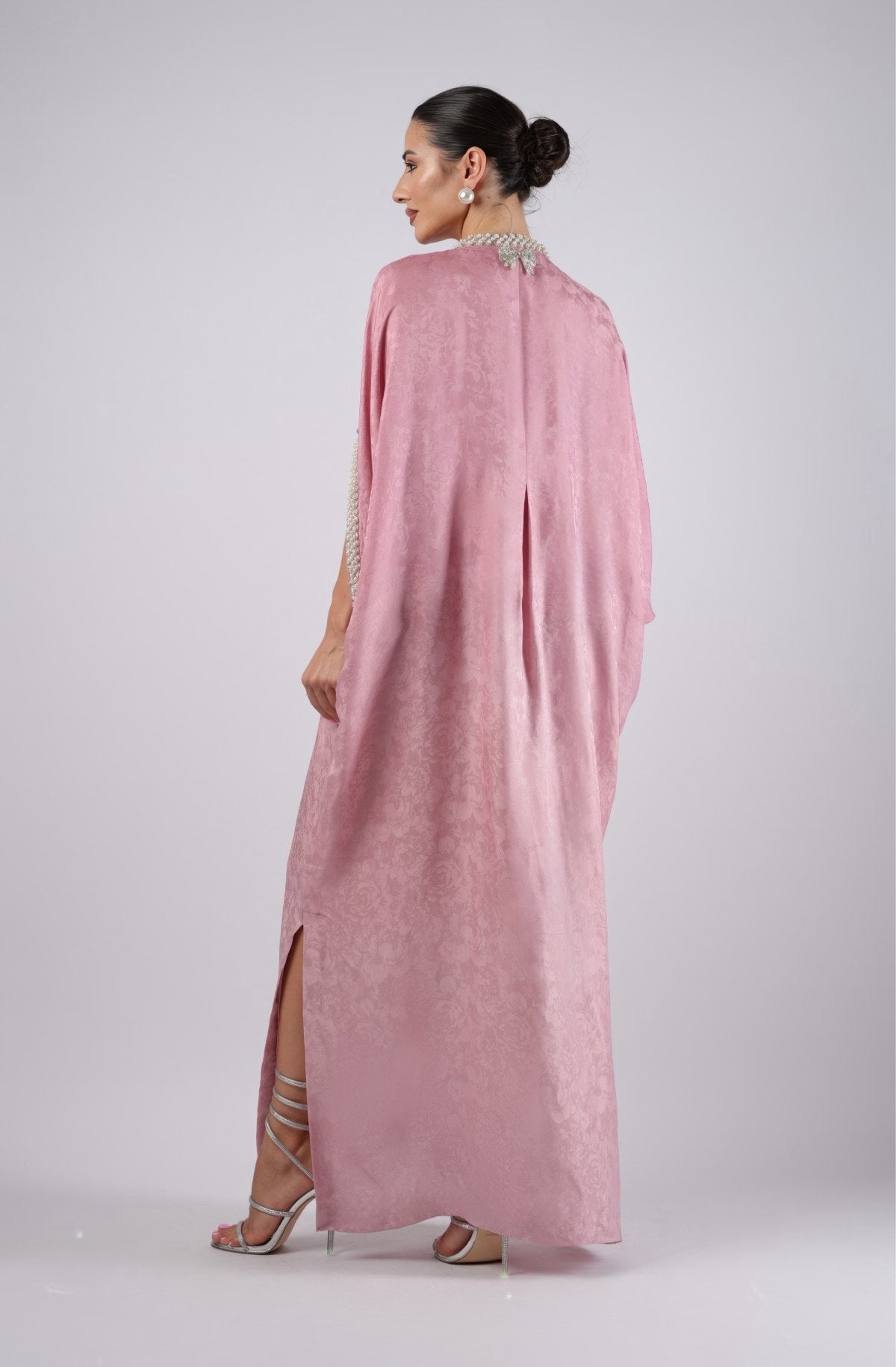 A drapey, feminine embossed Silk Kaftan with elegant Pearl and Swarovski hand work.