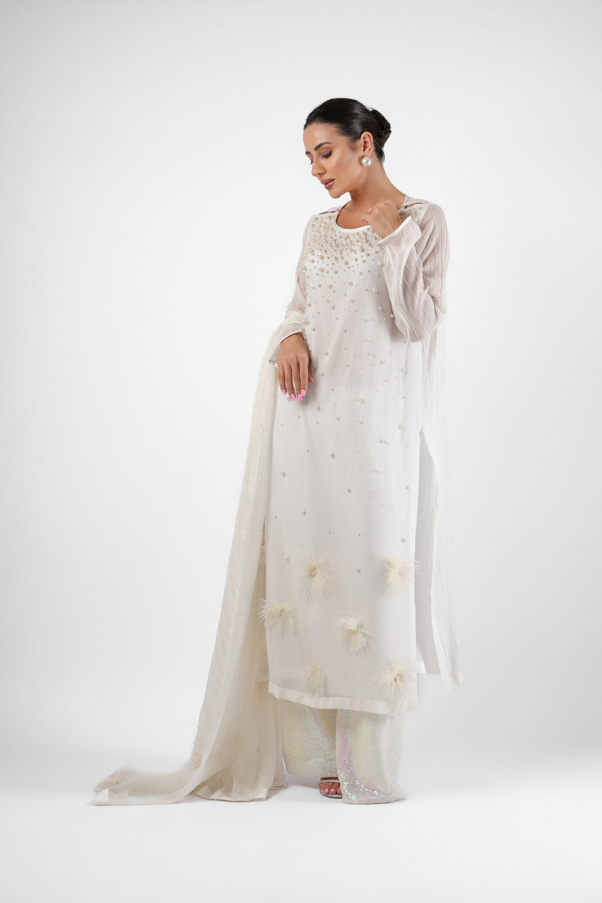 Comes as a 3 piece set with a matching trouser and embellished dupatta.