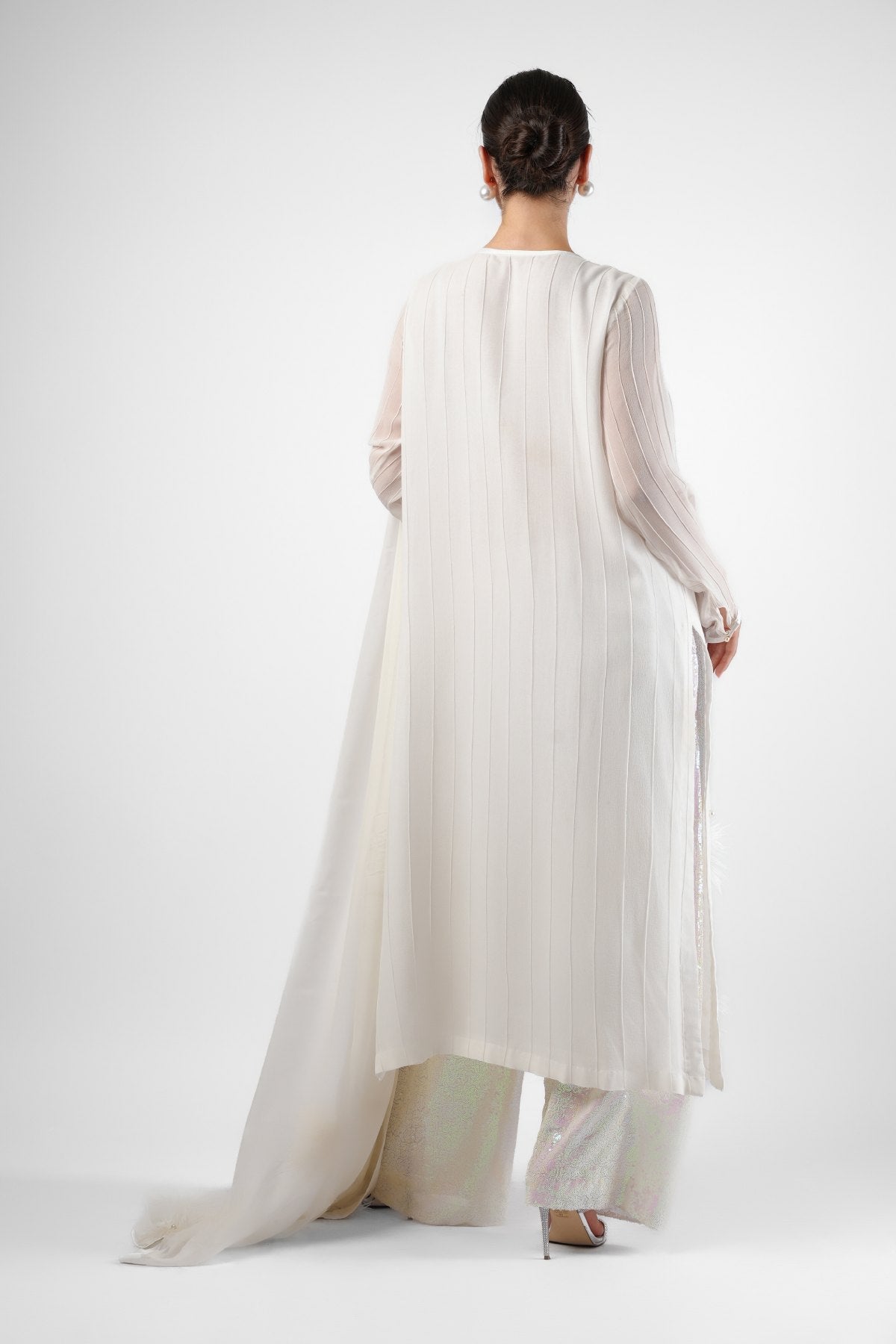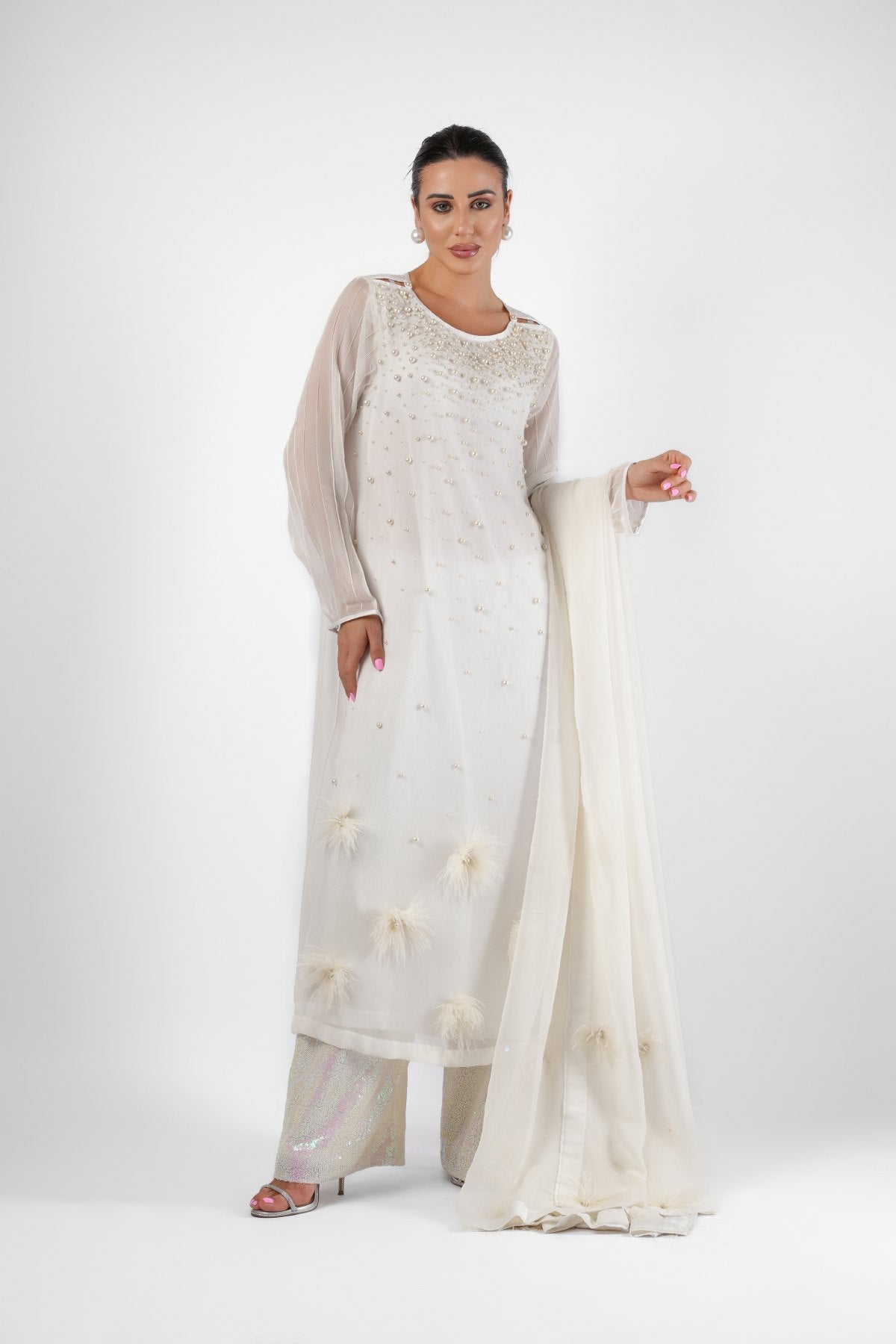 A Chic Georgette Chiffon ensemble embellished with pearls and feathers for a very chic and contemporary feel.