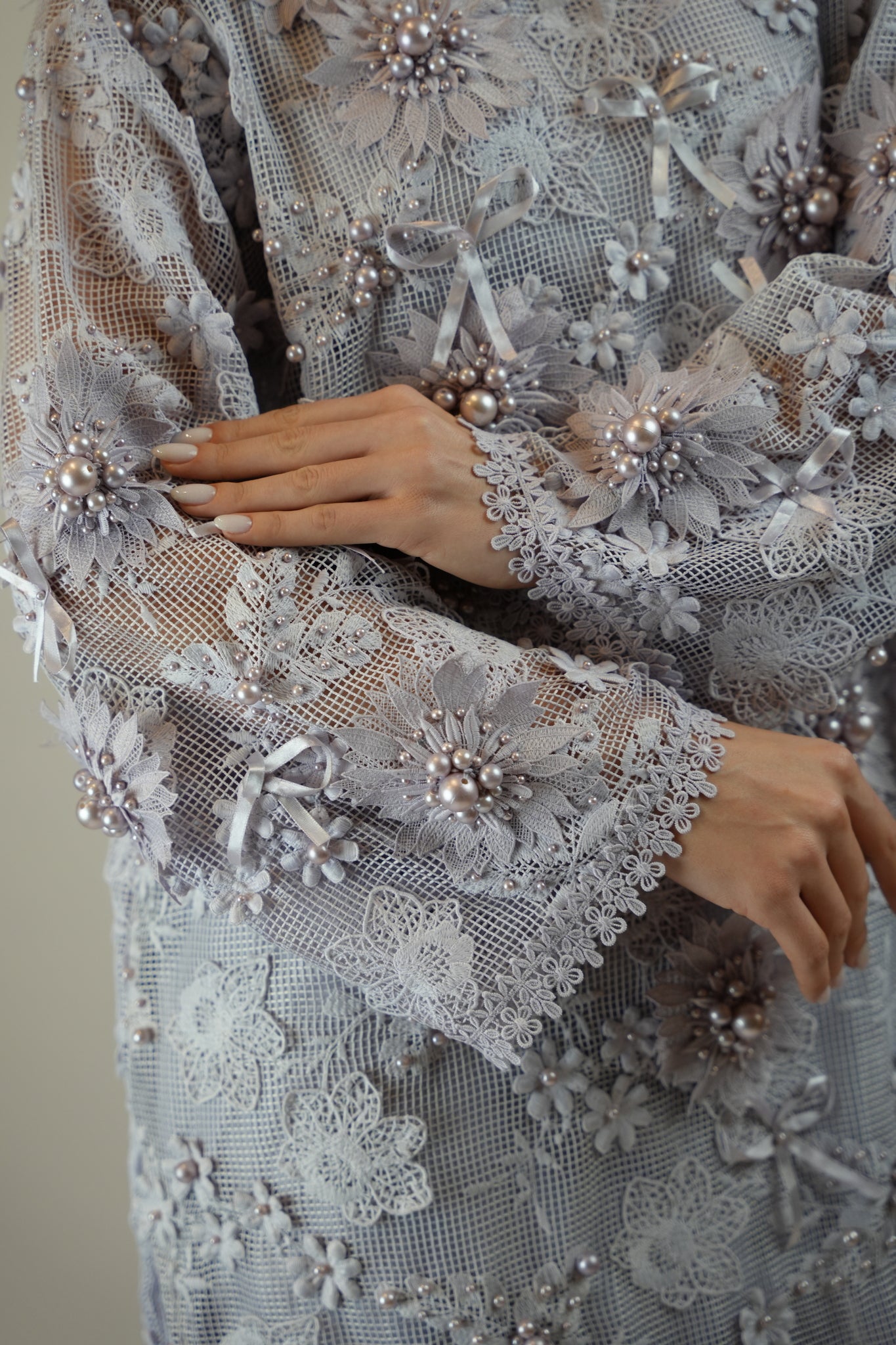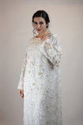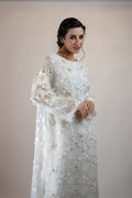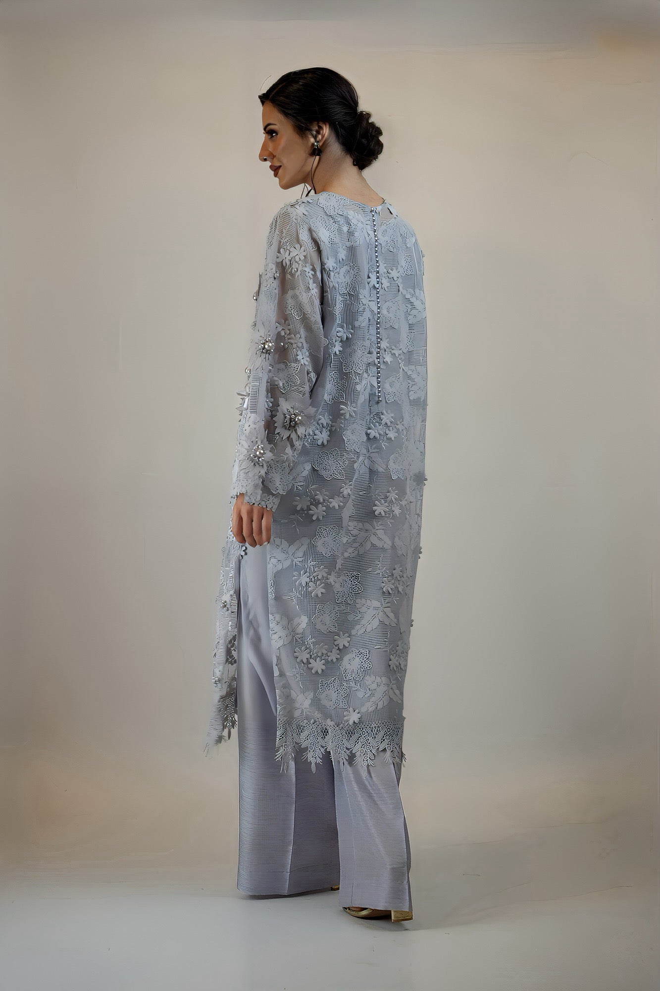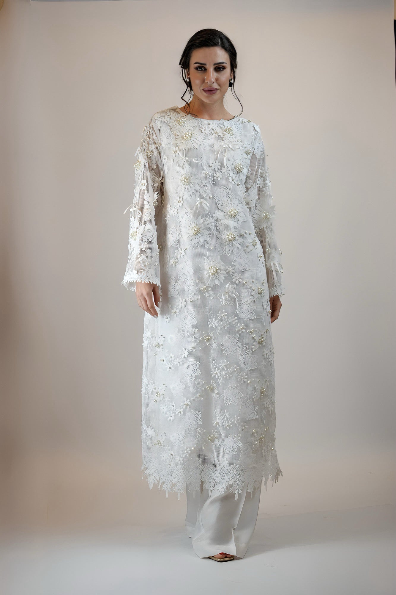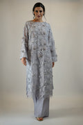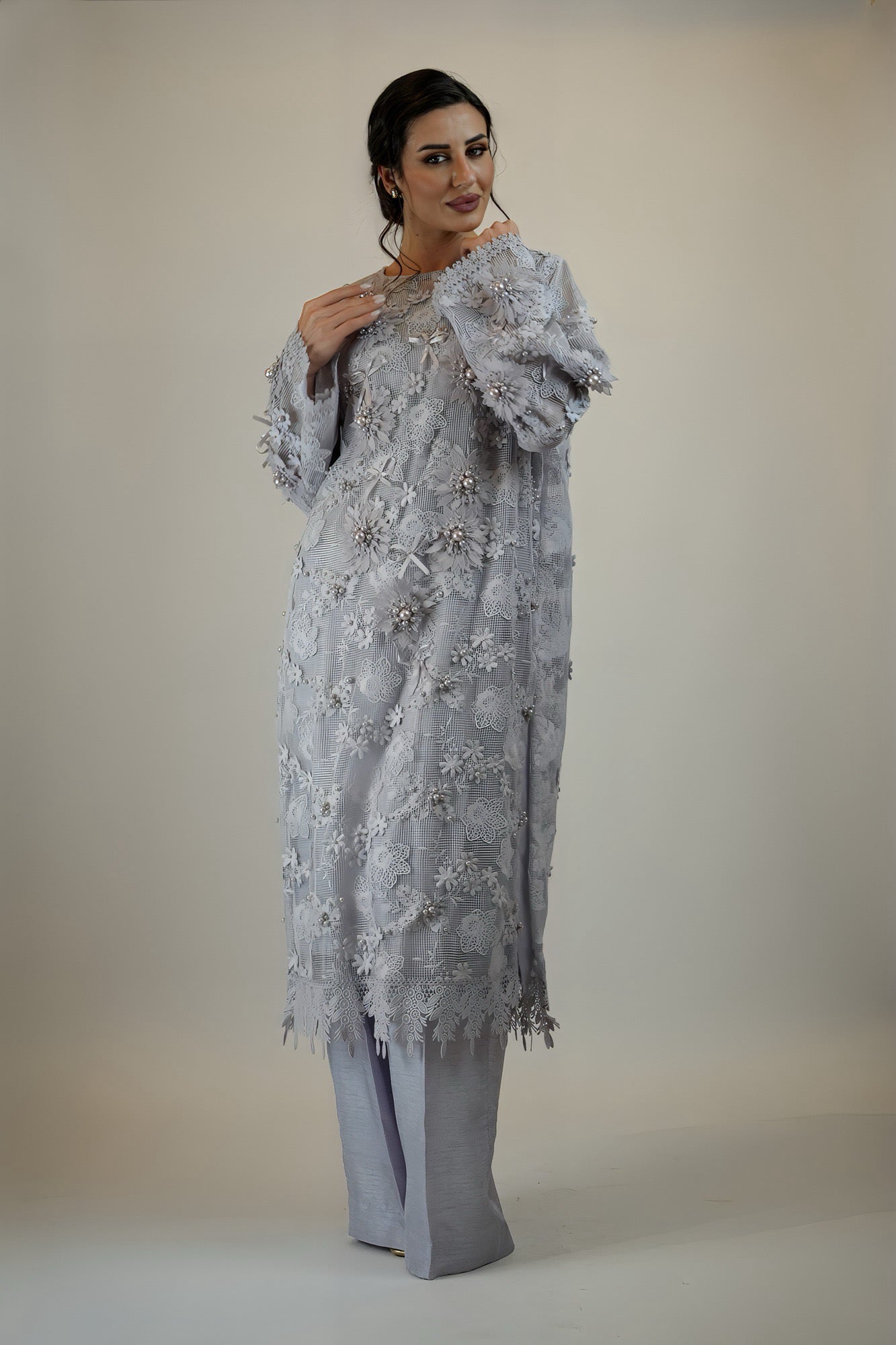 Step into a floral world with this gorgeous net outfit with appliqued flowers and bows and heavy pearl work for a gorgeous 3D effect. Paired with a straight trouser.