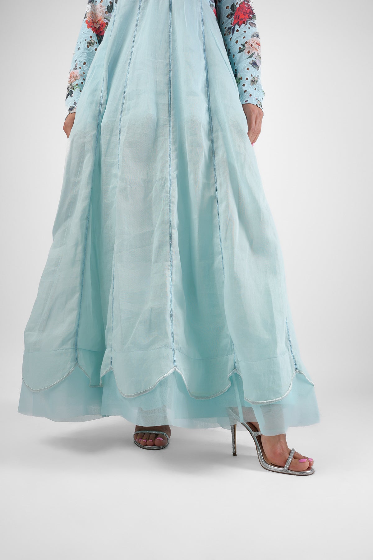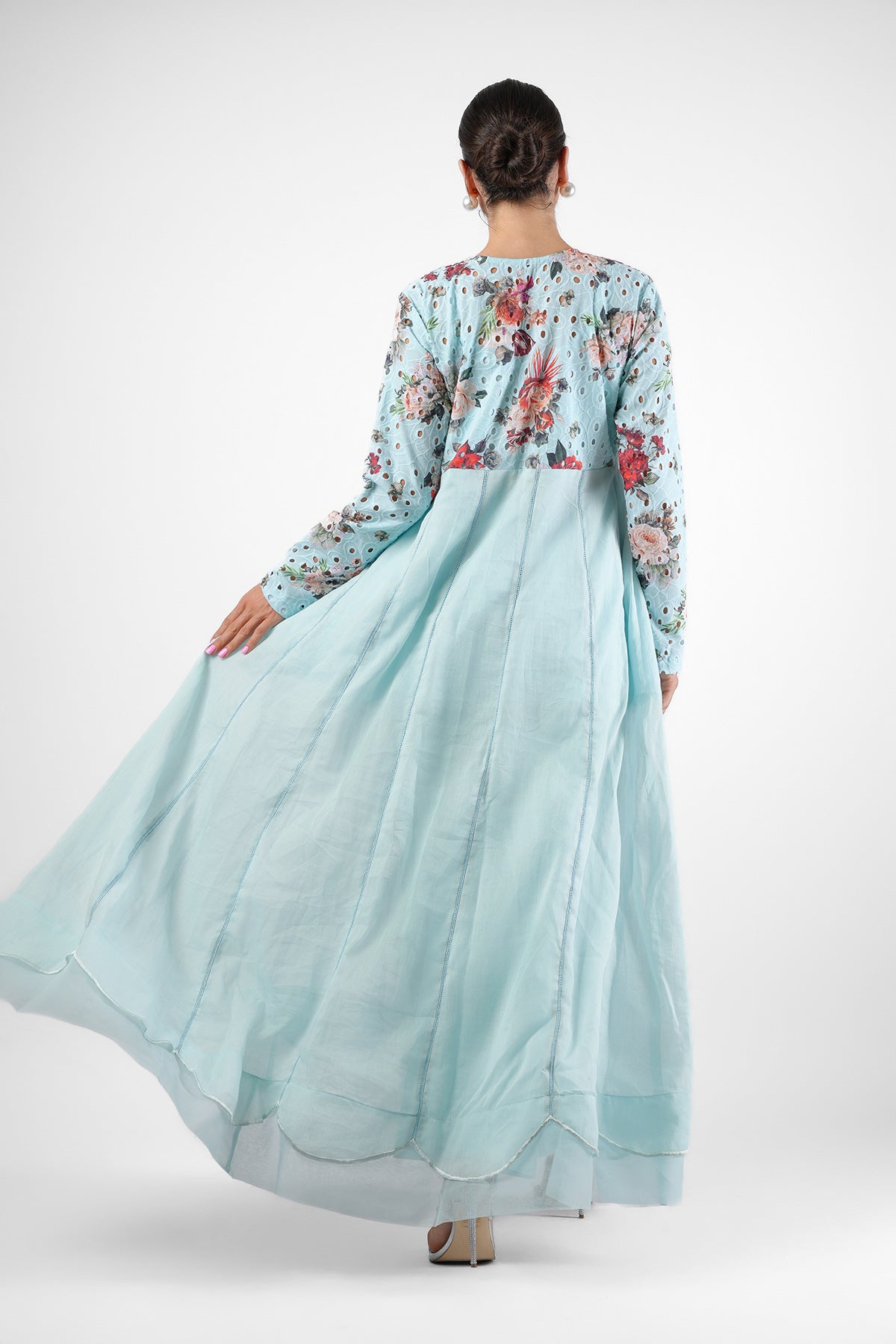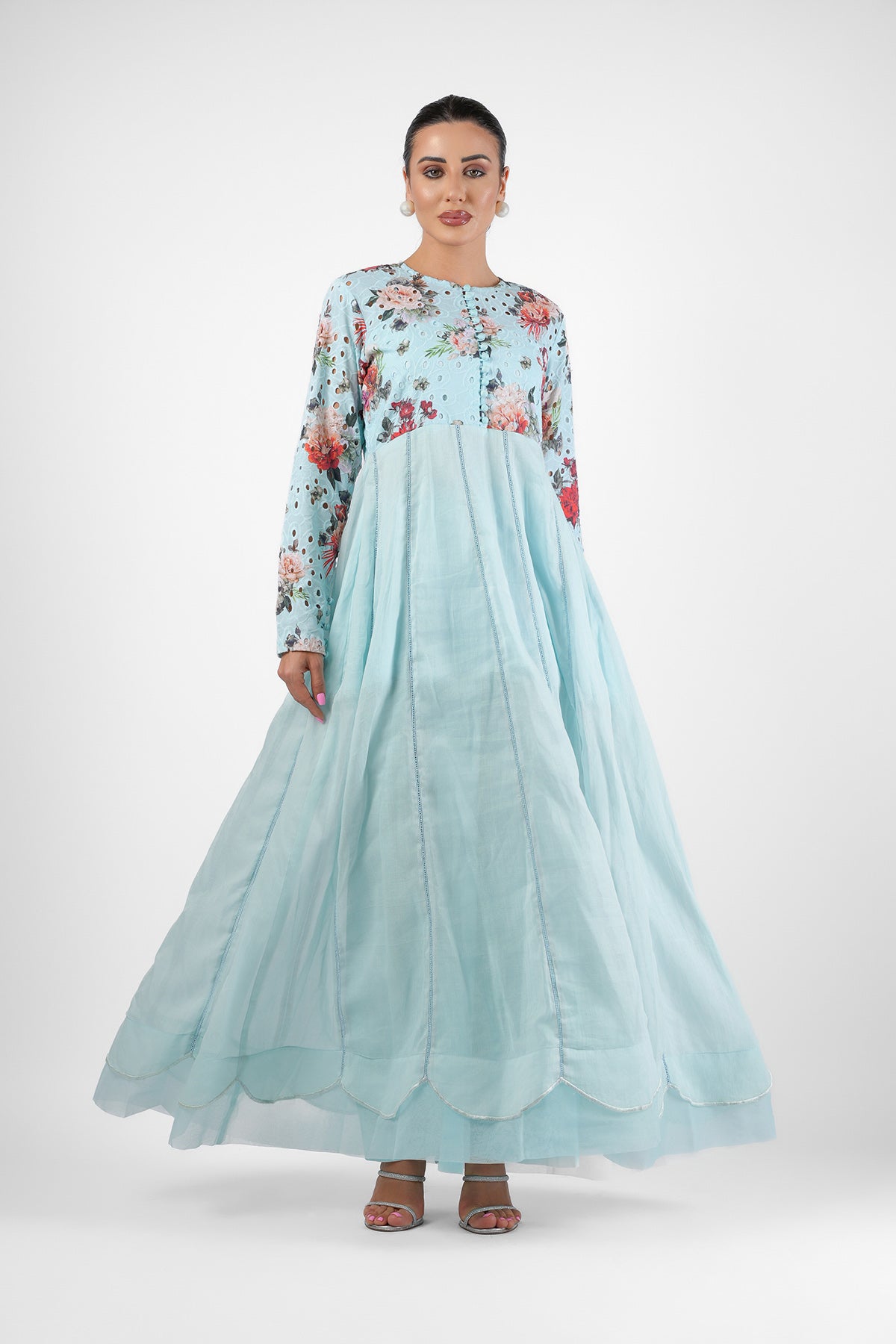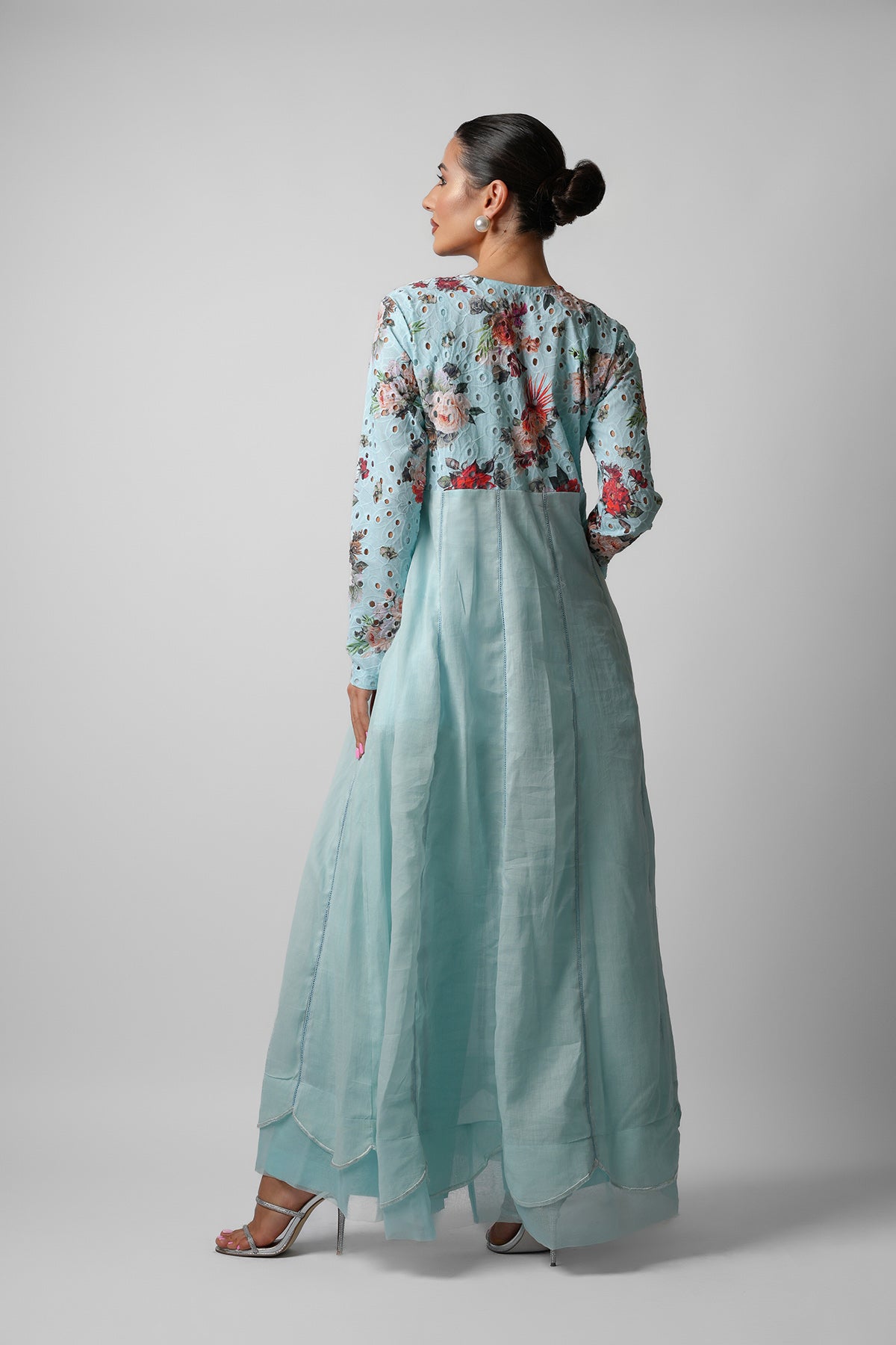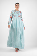 Printed Chikan panelled frock with beautiful finishings. Comes as a 3 piece set with a matching lawn trouser and dupatta.