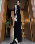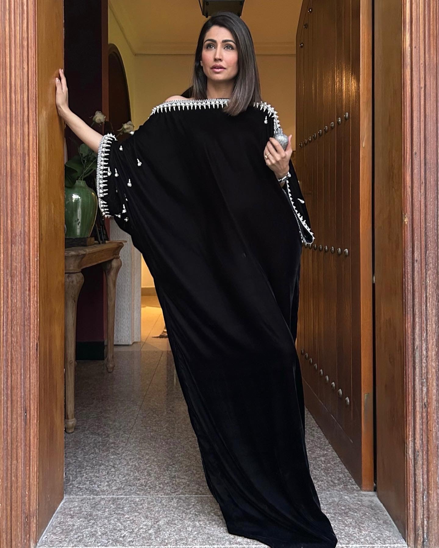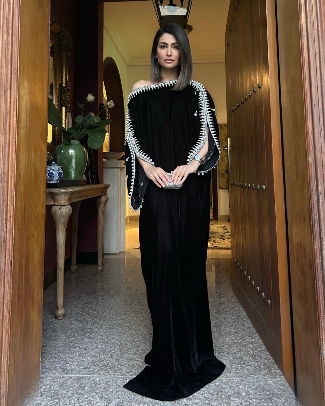 A gorgeous Velvet Kaftan with Pearls and Swarovski hand work on shoulders all the way down the sleeves.