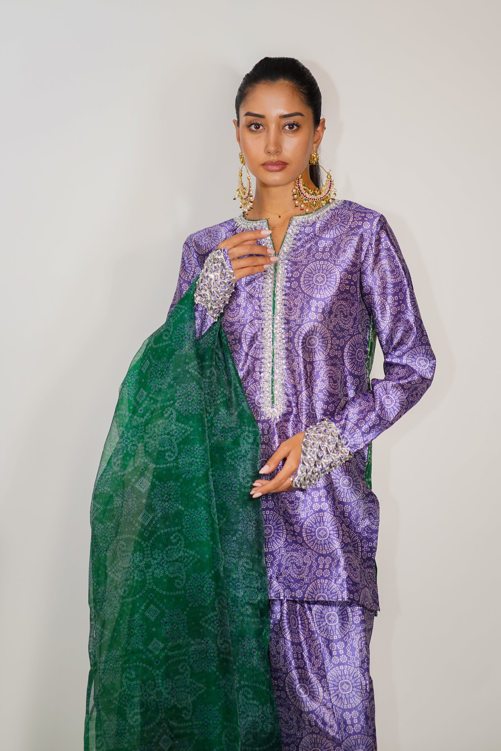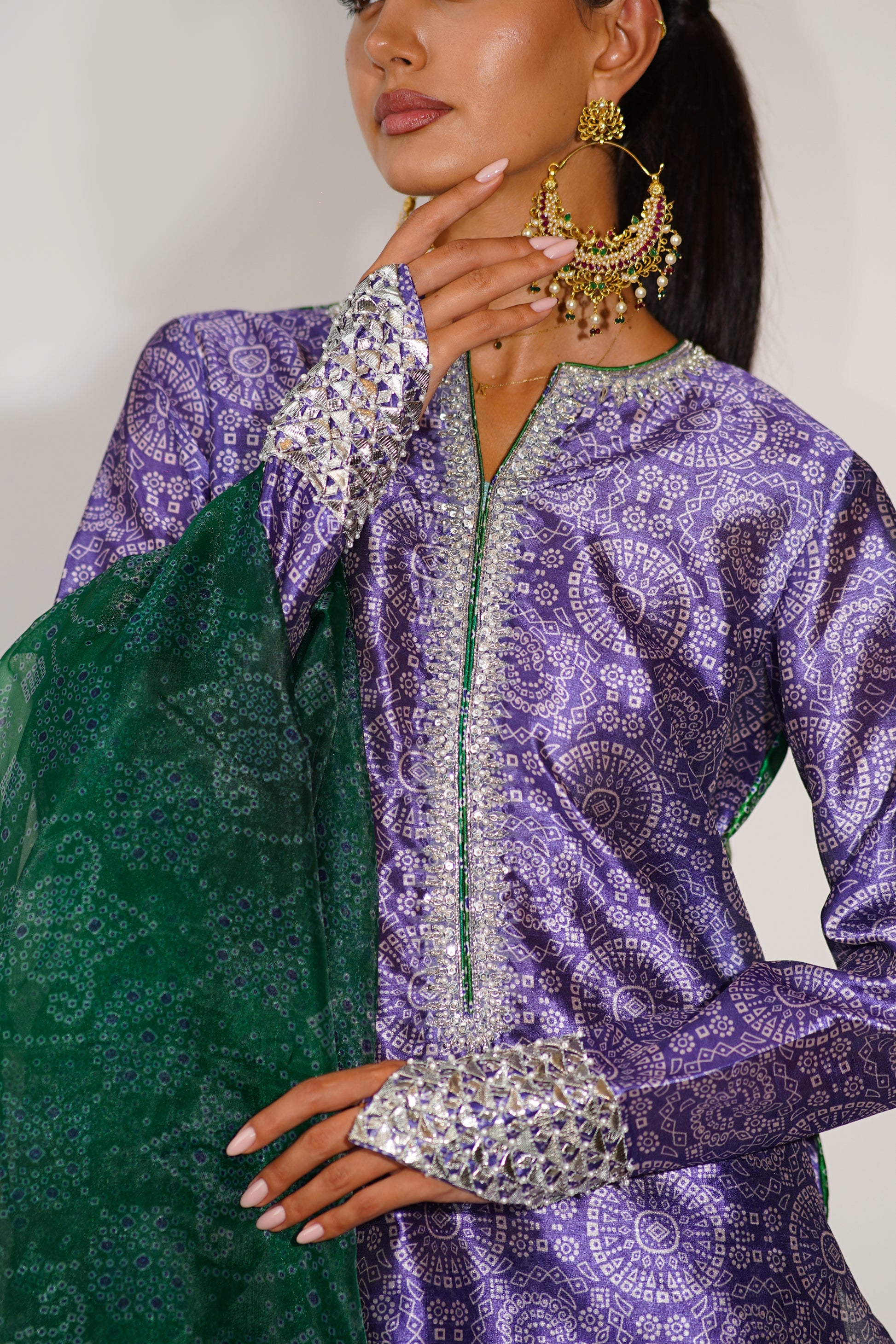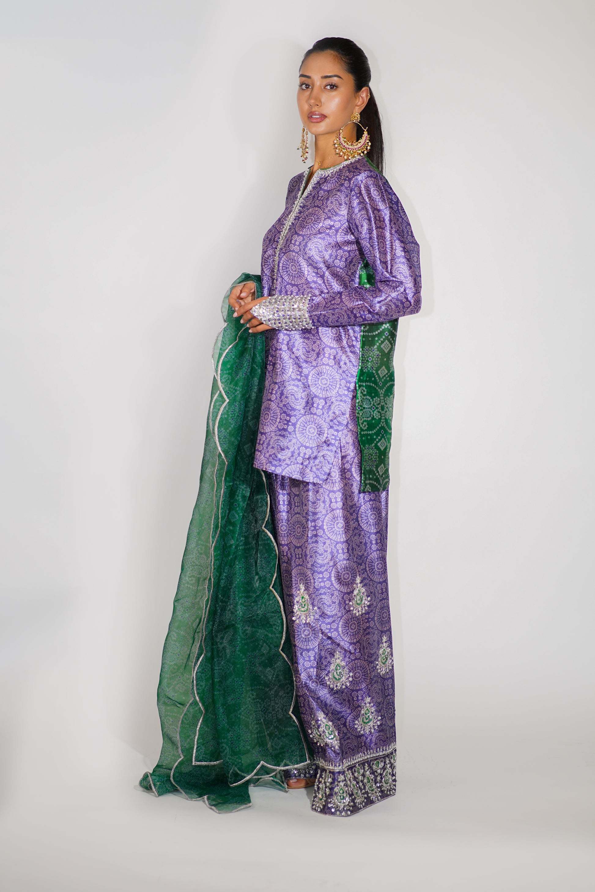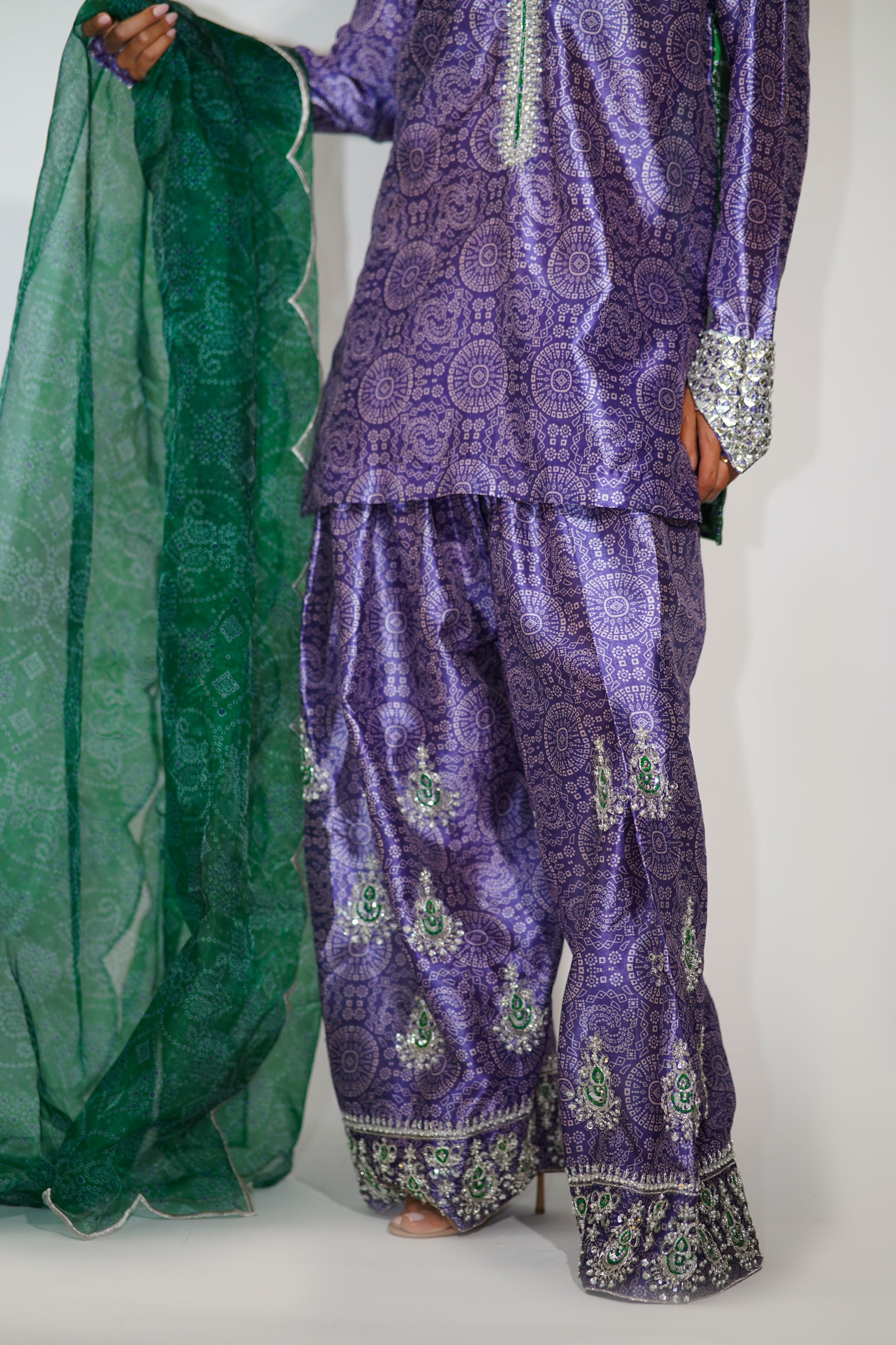 A complete traditional look with a farshi shalwar all hand embroidered with gota, nakshi and tilla.Its hand embroidered hand cuffs that look like a jewellery piece make it stand out. The color combination is a beauty that in its own.
