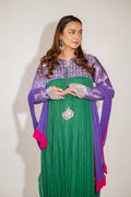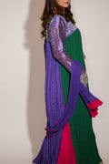 This traditional crushed long shirt with flair oozes sheer tradition. Paired with chunna dupatta adding to the look completing it with a contrasting trouser.